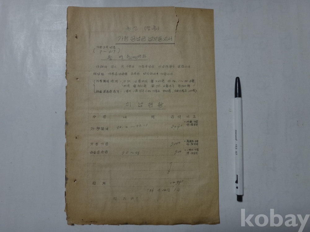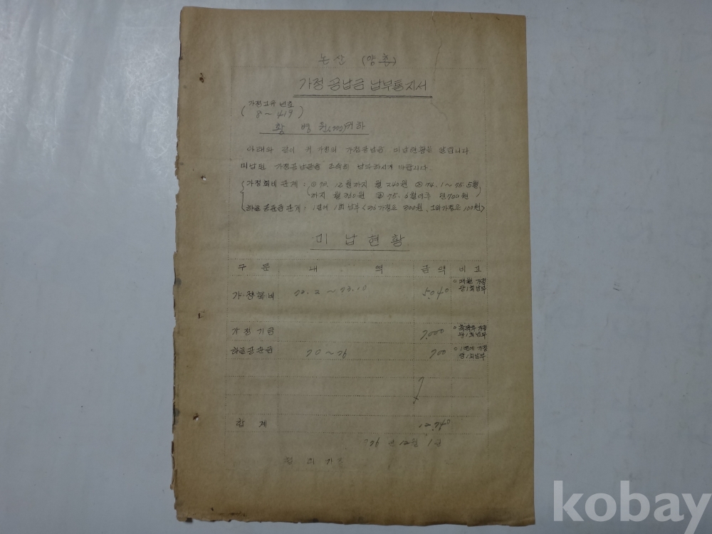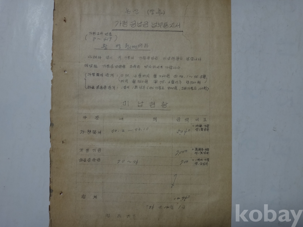 가정 공납금 납부통지서 - 가정회비, 하늘 공관금 (1972년, 논산)