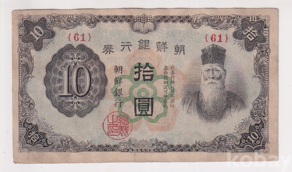 - 조선은행 1944년 갑 십원 - 판번호 61번 무번호권 사용제 지폐