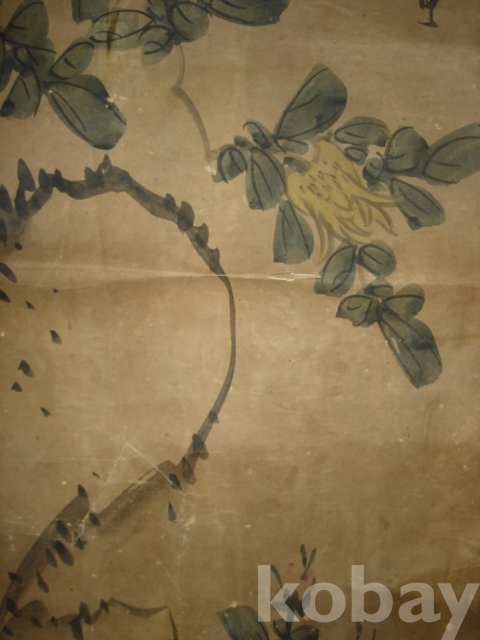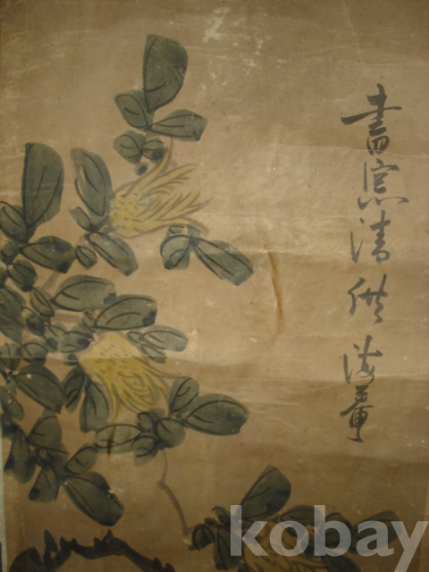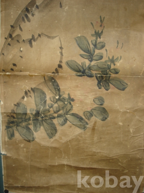 연대있어 보이는 장지에 그린 고화 꽃 그림으로 오래되어 갈라지고 종이가 낡고 얼룩이 보임.