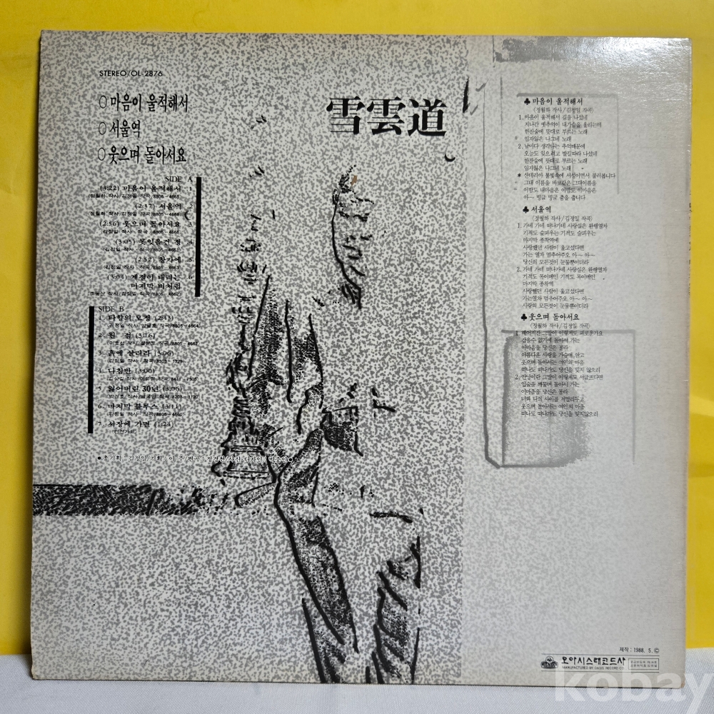 | 자켓상태 | EX : 약간의 마모, 모서리 찢김 존재 | 음반상태 | EX : 재생에 영향 없는 가벼운 기스 존재 | 발매정보 | 초반 | 가사지여부 | 무 |