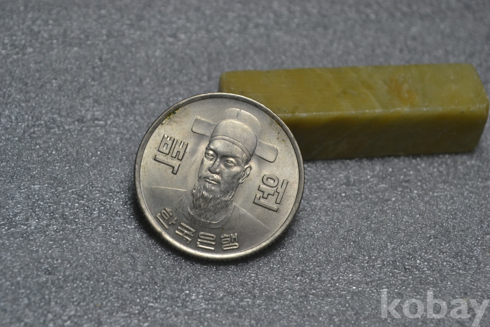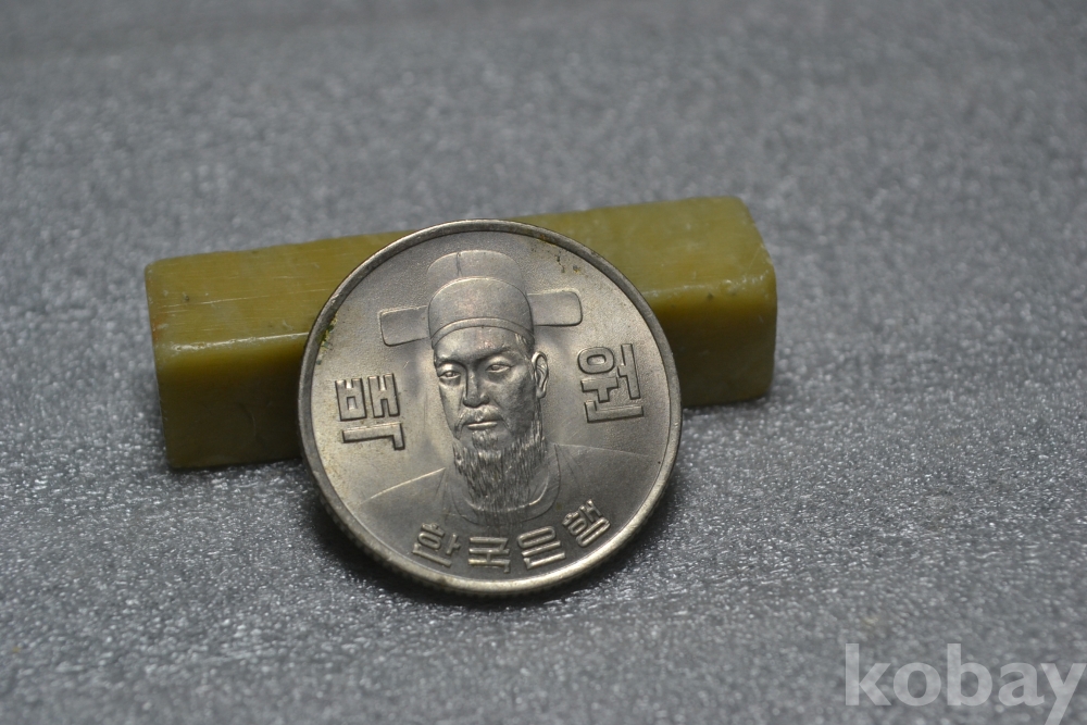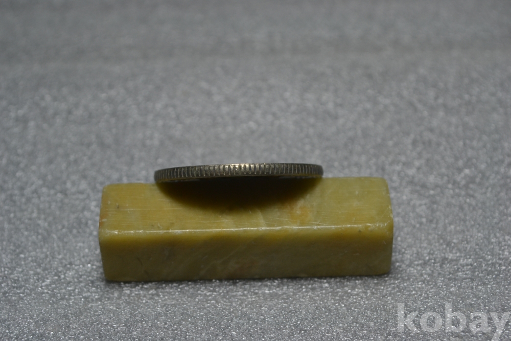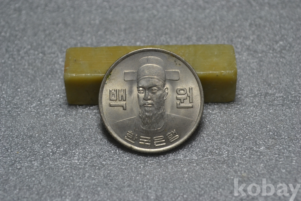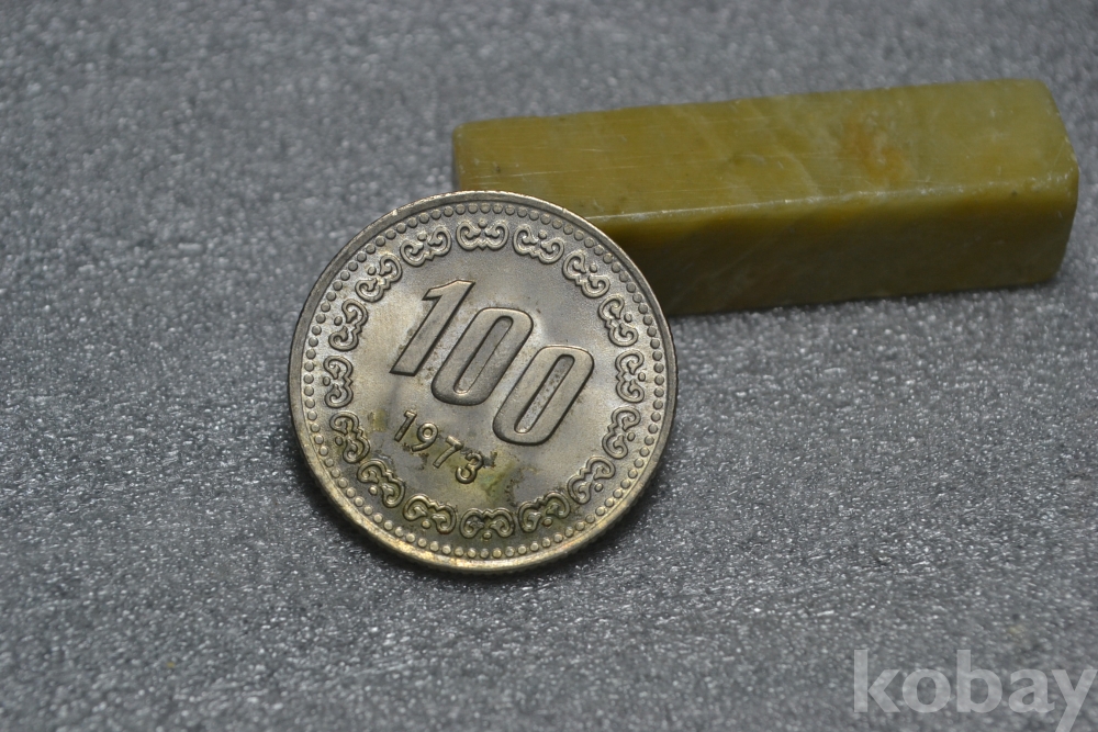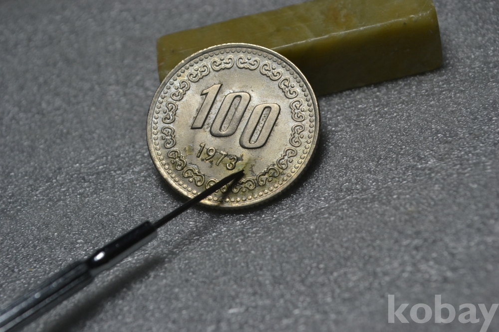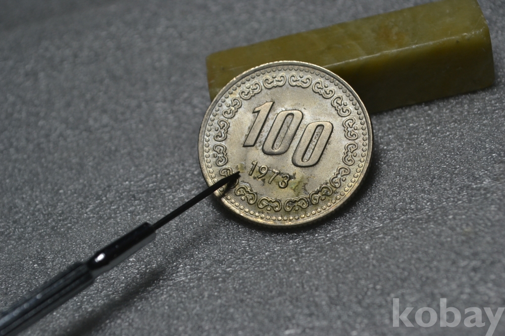 주화의 뒷면을 보시면 아래쪽 년도표기 부분 근처로 표면부 접착제 묻음흔적등이 일부 보입니다. (검은핀으로 가르킨 부분 사진참조)
