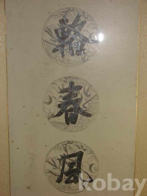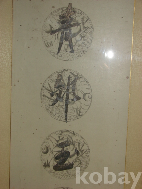 # 냉금선지에 쓰여진 글씨로 상태는 오래된 흔적과 몇 군데 갈라진 곳 있음. 액자는 낡아 작품만 보냄. H - 옥션 보증서 있음.