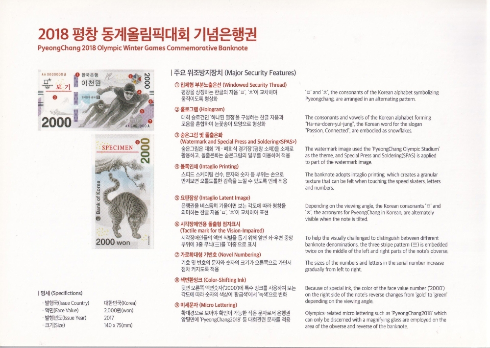 - 평창올림픽 기념 최초 이천원권 AAA0001509 빠른번호 미사용 지폐- 기념첩포함