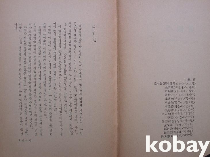 내표지 뒤에 분야별 집필자들이 밝혀져 있다. <머리말>에서 외국학계의 요청에 의해 영문판으로 한국학 개관서를 간행하였는데 그 한국판을 간행한 것이라고 하였다. 그렇기에 "가장 첨예한, 또는 원로급인 현역 학자의 집필"이기에 자랑이 된다고 하였다.
