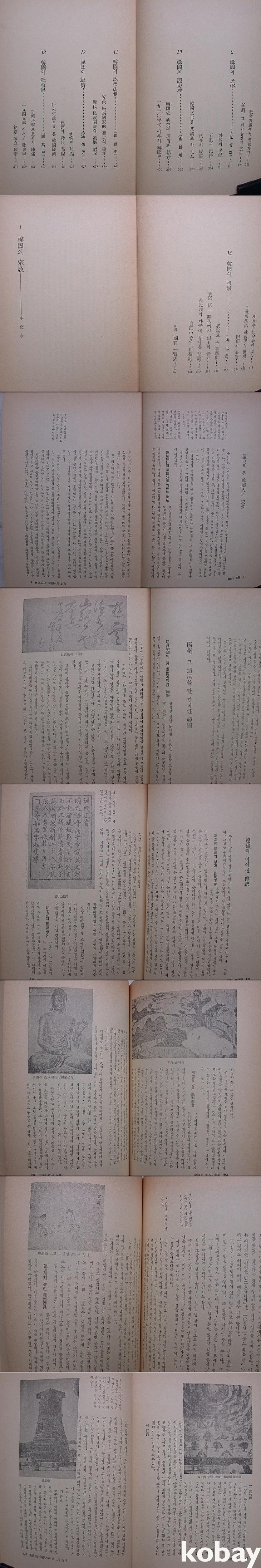 본문은 종교, 철학, 국어학, 고전문학, 현대문학, 고고/미술, 고전음악, 연극, 민속, 역사학, 정치법제, 경제, 사회학, 과학으로 전체가 14장으로 나뉘어 있으며 이기영 박종홍 이기문 정병욱 김원룡 이혜구 임석재 김철준 최창규 변형윤 이만갑 홍이섭 등이 집필하였다. 간간이 사진도판이 들어가 있으며 두주 공간이 있다.