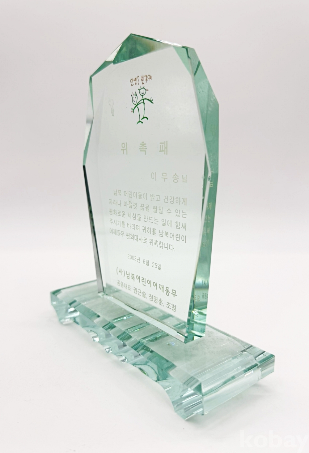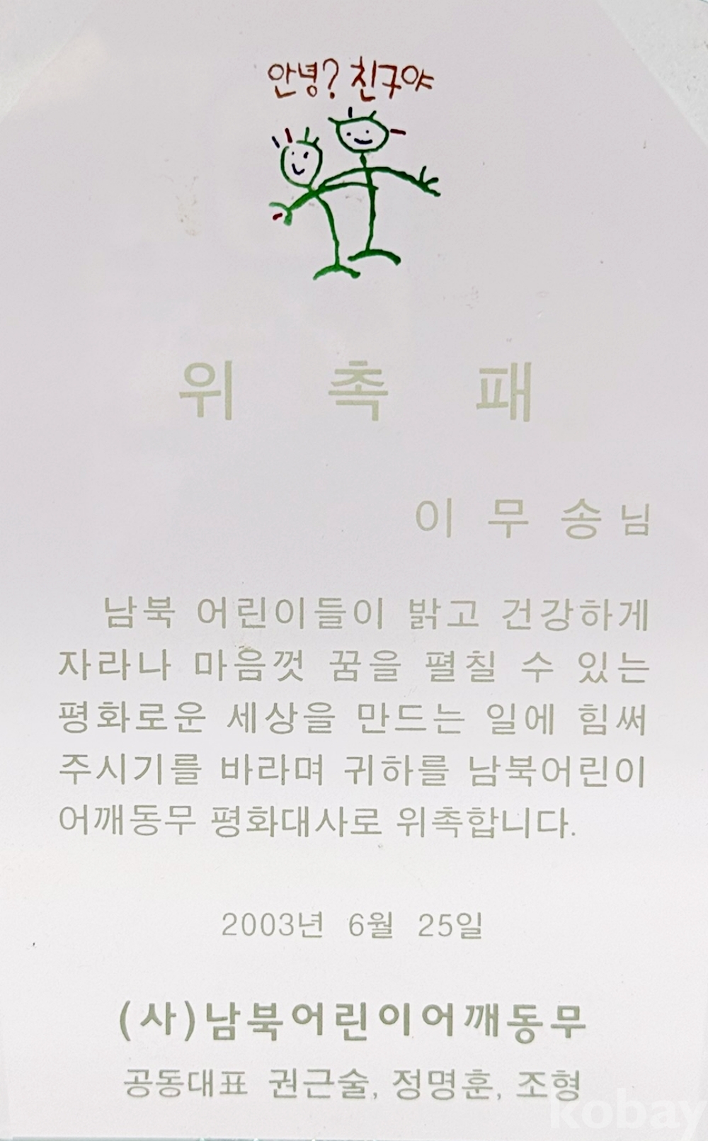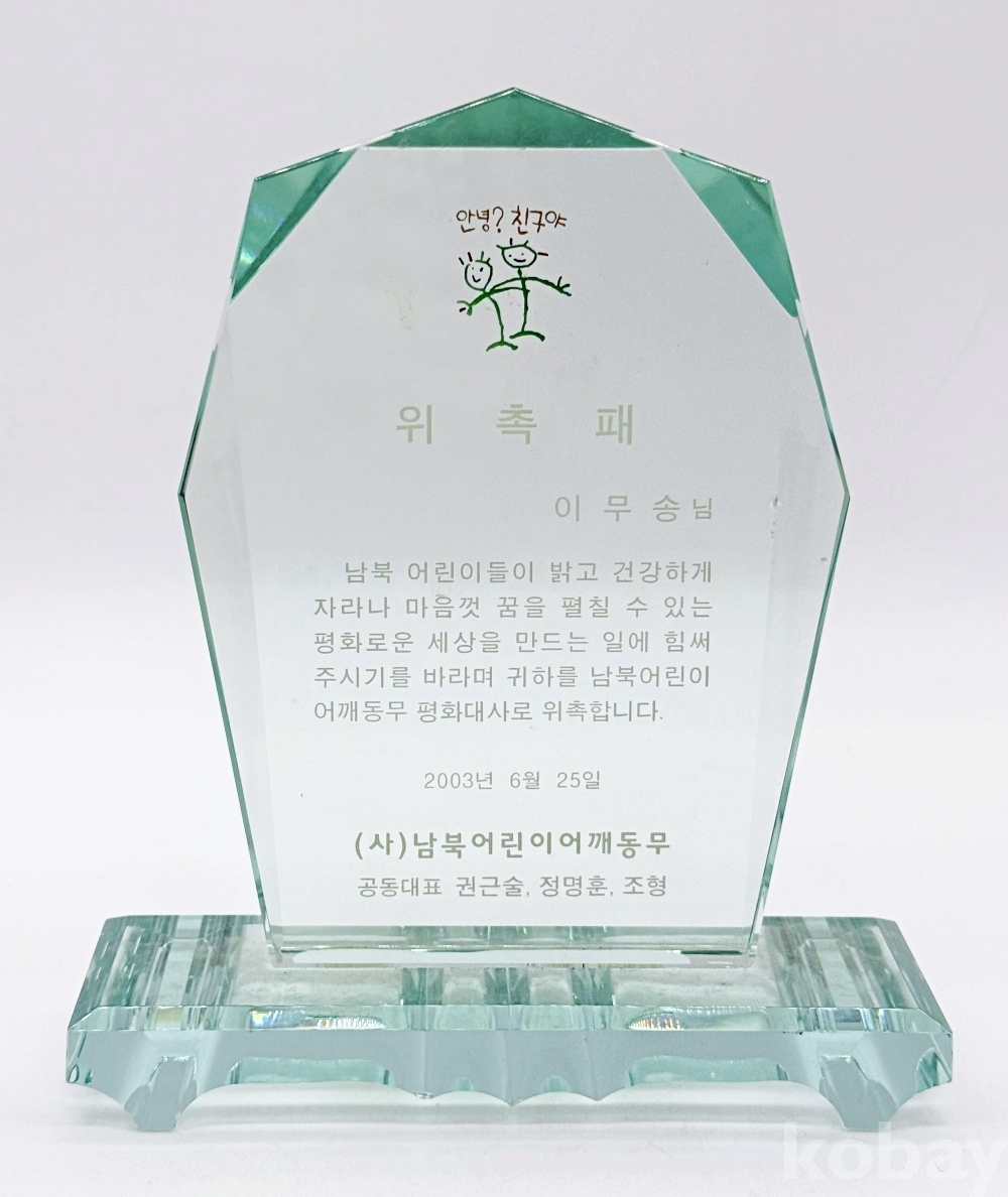 2003년 가수 이무송이 (사)남북어린이어깨동무 평화대사로 위촉되었음을 알리는 위촉패이다. | ||