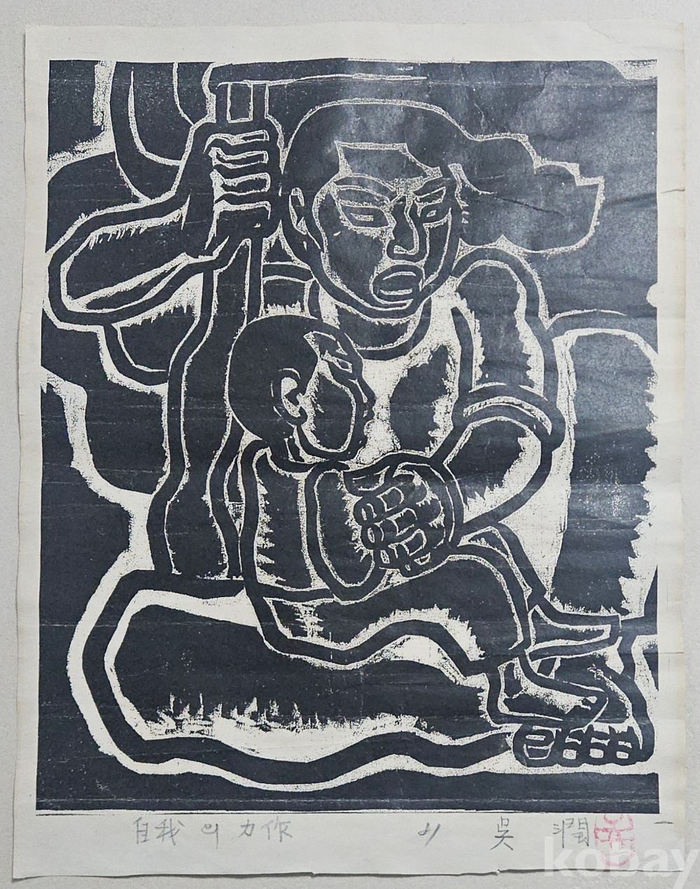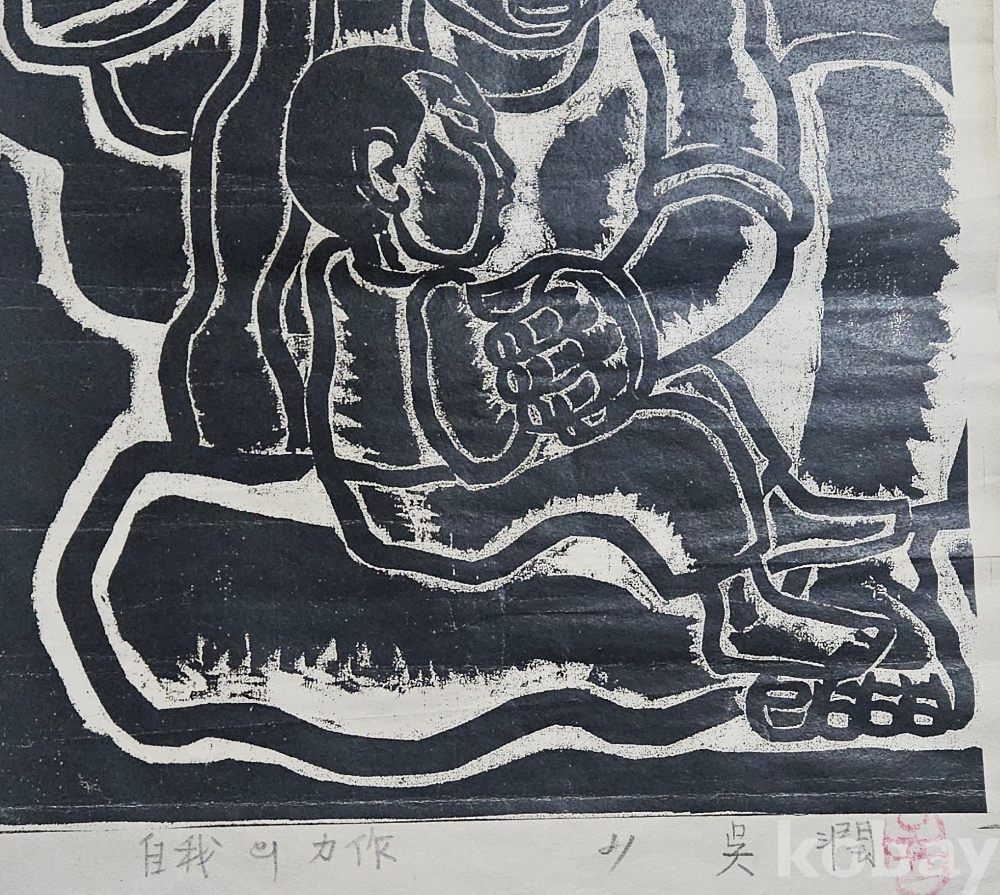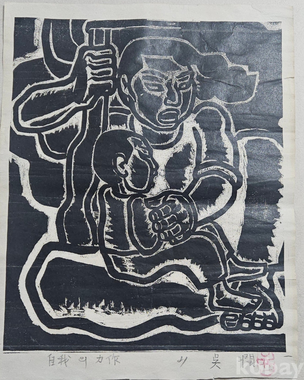 제목("自我의 力作"81(吳潤,오윤 ) 작가수결 있는판화