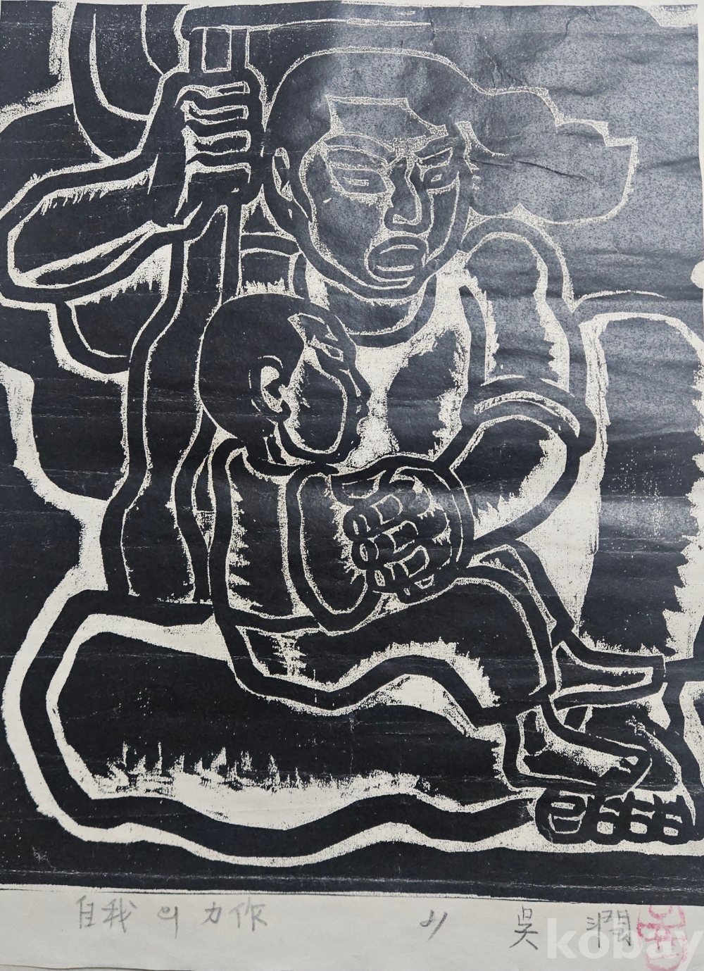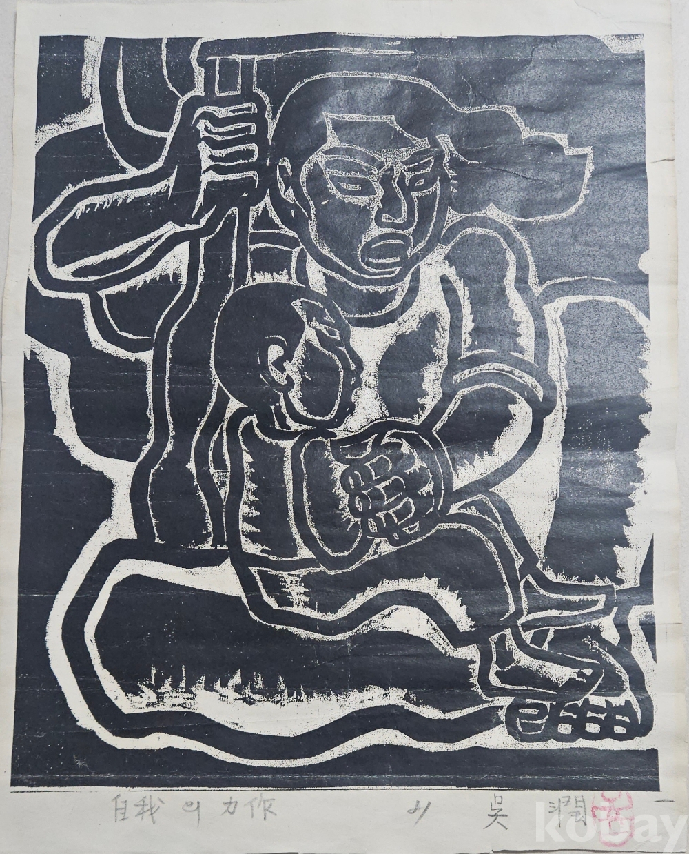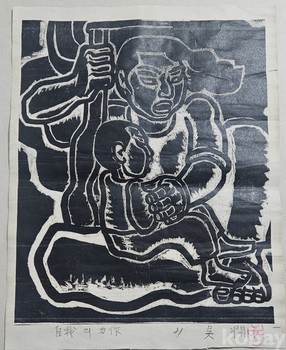 제목("自我의 力作"81(吳潤,오윤 ) 작가수결 있는판화