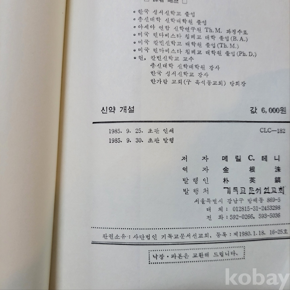 [천원경매] 신약개설 (메릴 C. 테니/기독교문서선교회/1985초판) : 중급/서고-T305