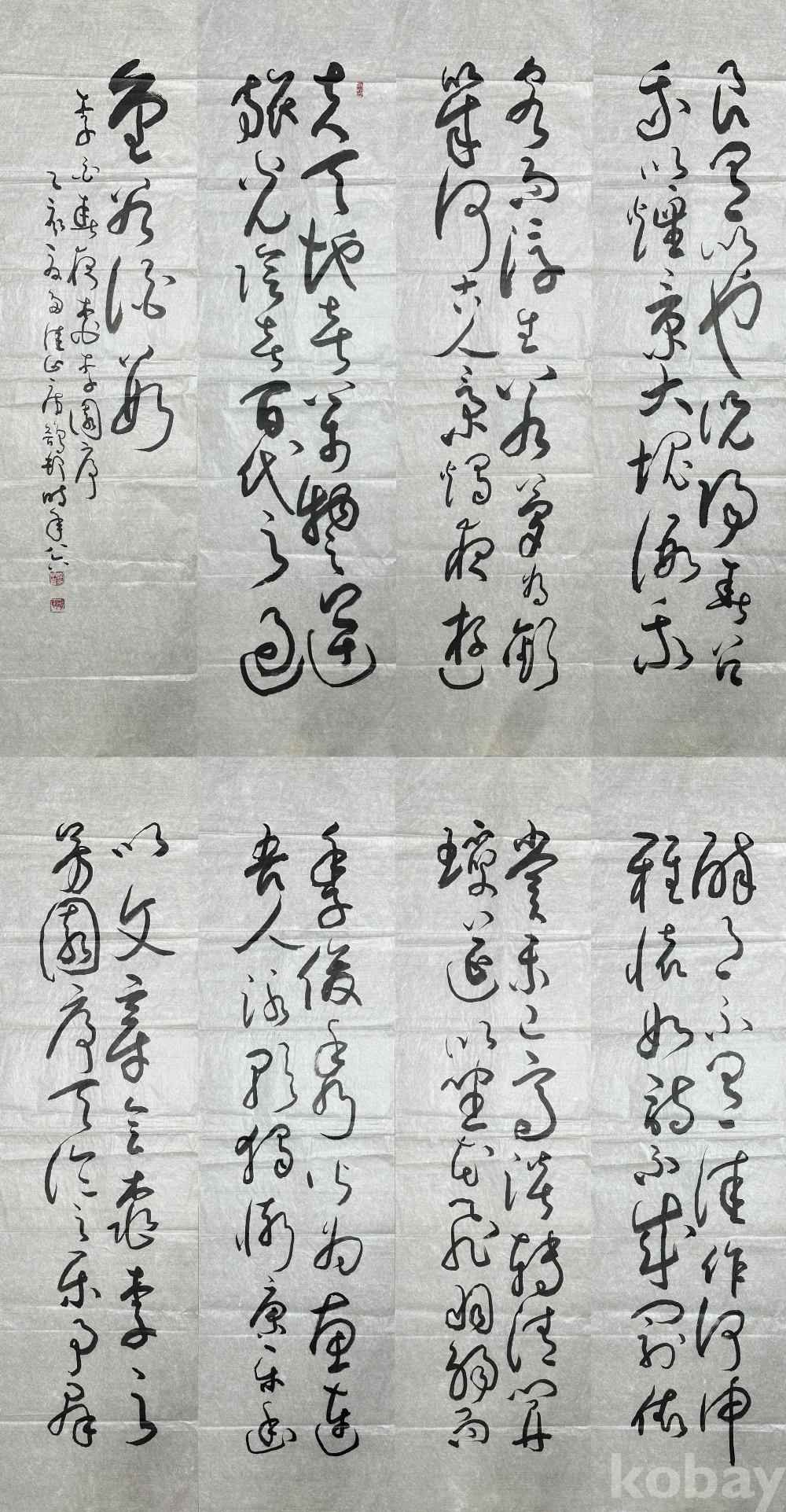 본 작품은 종이에 먹으로 쓰여진 고전 서예 작품으로 총 8장으로 구성된 대형 다폭 서예이다. 행서와 초서 계열의 필체가 혼합된 구성으로, 획의 생략과 연결이 자연스럽고 필의의 흐름이 강하게 드러난다. 글자의 구조보다는 기세와 운필의 리듬을 중시한 표현이 특징이며, 여덟 장이 하나의 흐름으로 이어져 전시 시 공간감을 크게 살릴 수 있는 작품이다. 대형 서예 구성 특유의 존재감이 있어 컬렉션용 또는 인테리어 전시용으로 활용도가 높다.