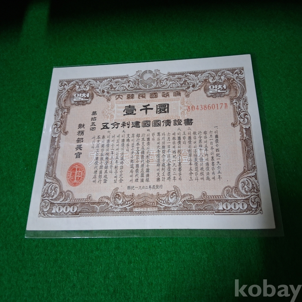 대한민국 1962년 건국채권 15회 1000환 미사용--