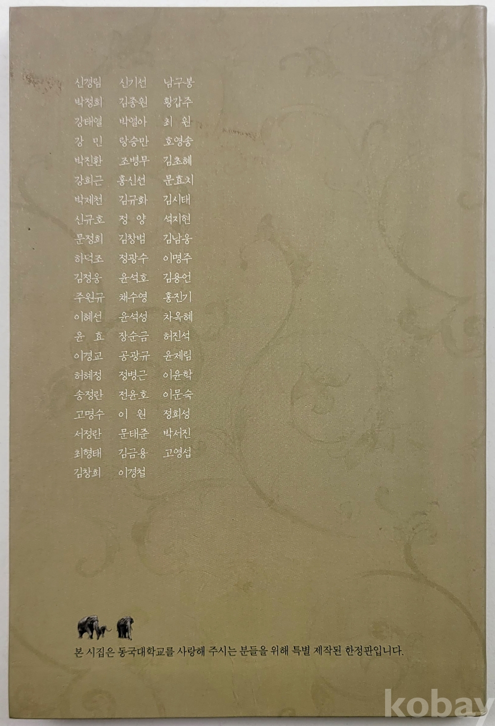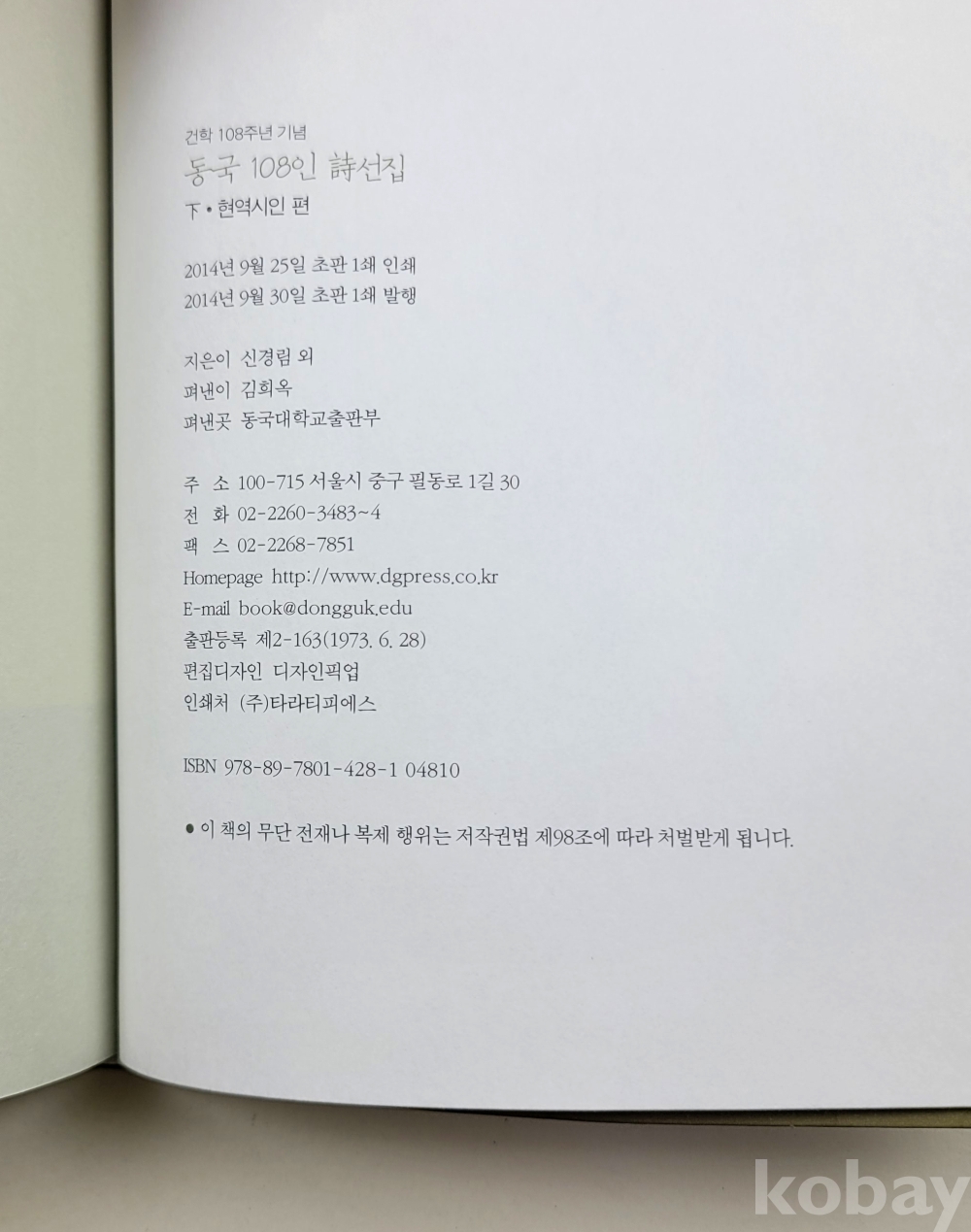 물 품 명 | 동국 108인 시선집(하) : 현역시인 편 / 건학 108주년기념 / 2014년 초판 / 동국대학교출판부 |