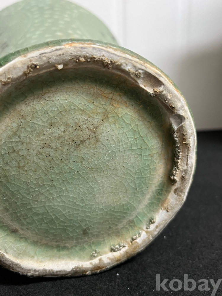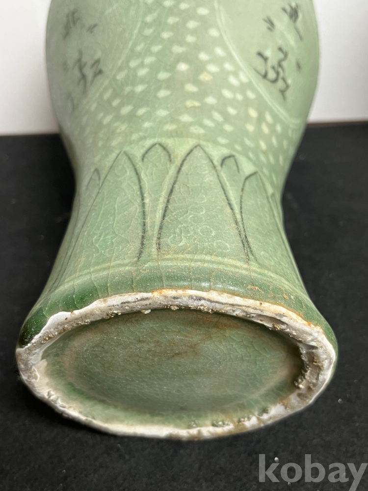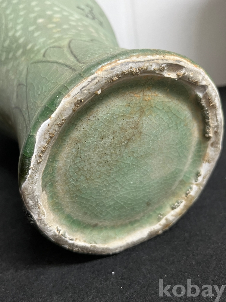 상감기법으로 무늬가 들어가져 있으며, 저부에 유약의 흐름이 그대로 보여집니다.