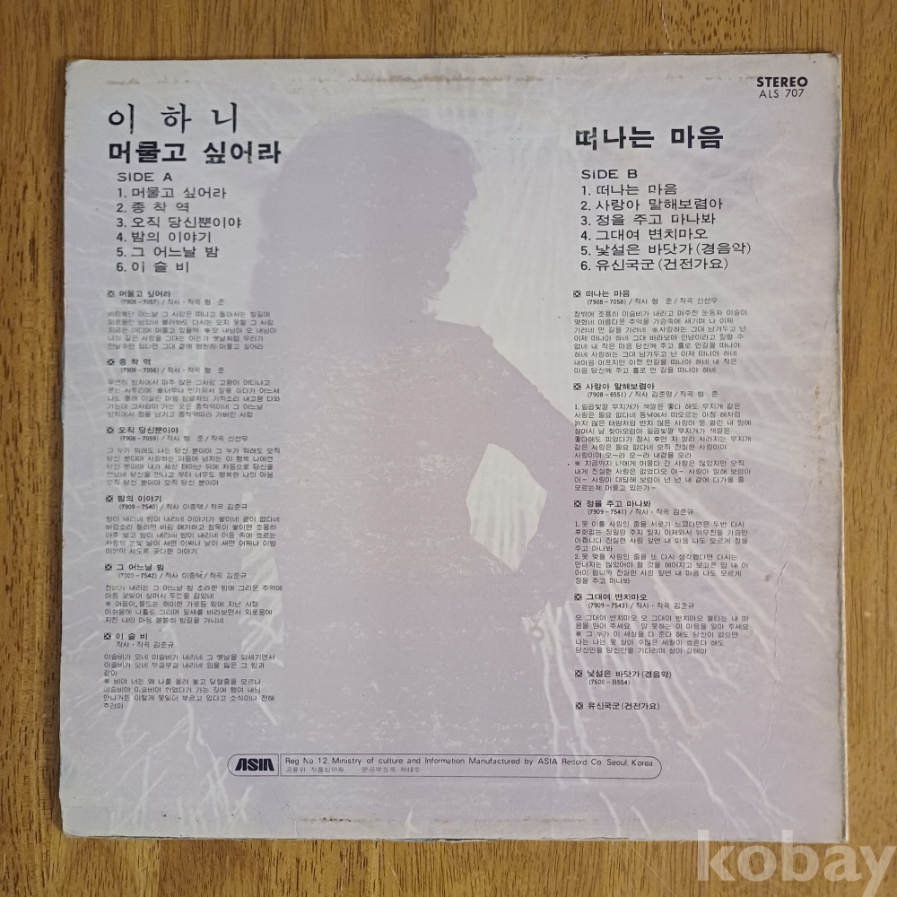 | 자켓상태 | EX : 약간의 마모, 모서리 찢김 존재 | 음반상태 | EX : 재생에 영향 없는 가벼운 기스 존재 | 발매정보 | 초반 | 가사지여부 | 무 |