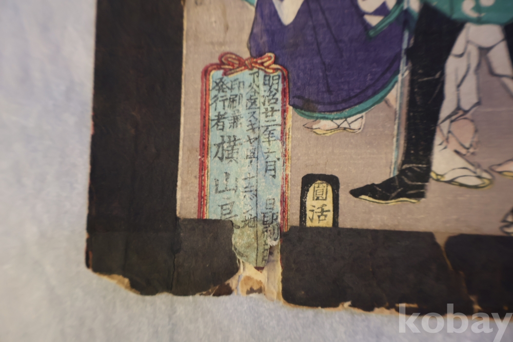 일본 목판화 원본 3 세트 임니다 세월의 흔적을 가진 고미술 목판화 이며 발행 년도와 화가의 낙관을 가진 극히 귀한 소제를 가진 명품 임니다 화가는 치가노부 [조선 통신사가 보이는 목판화 3 세트 명치 22 1889 뒤에는 배접 종이가 보임니다