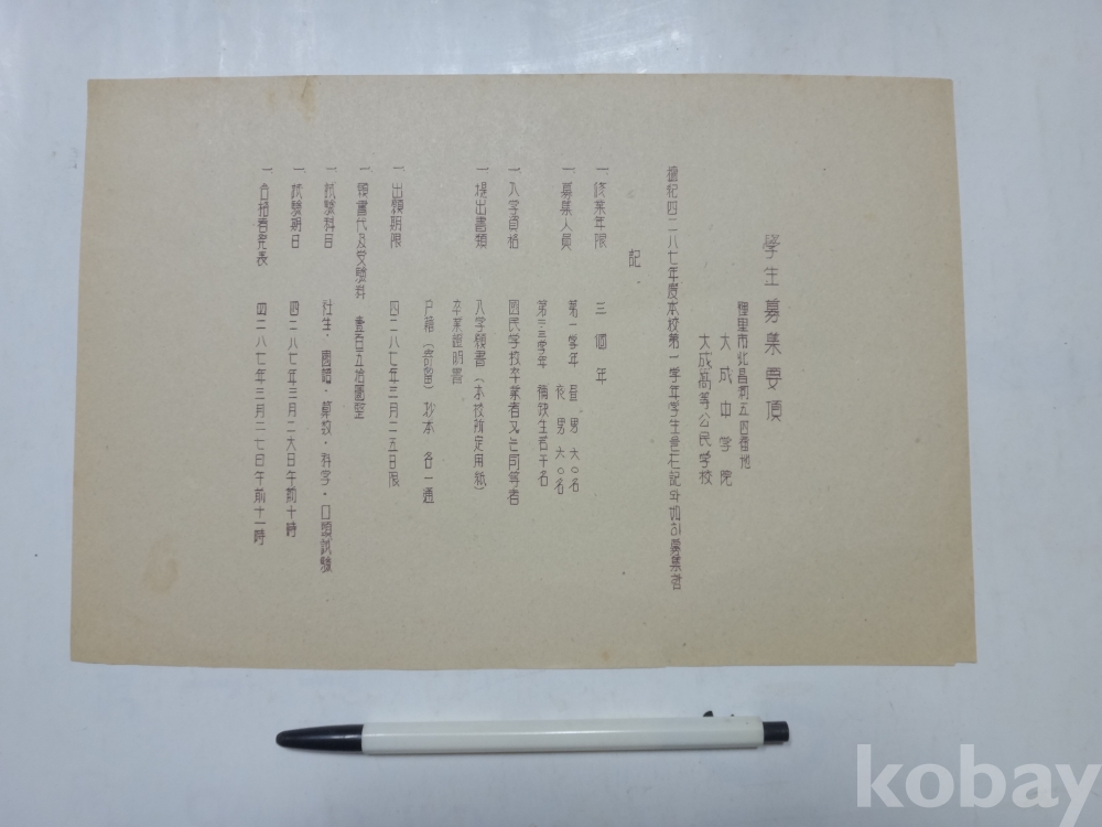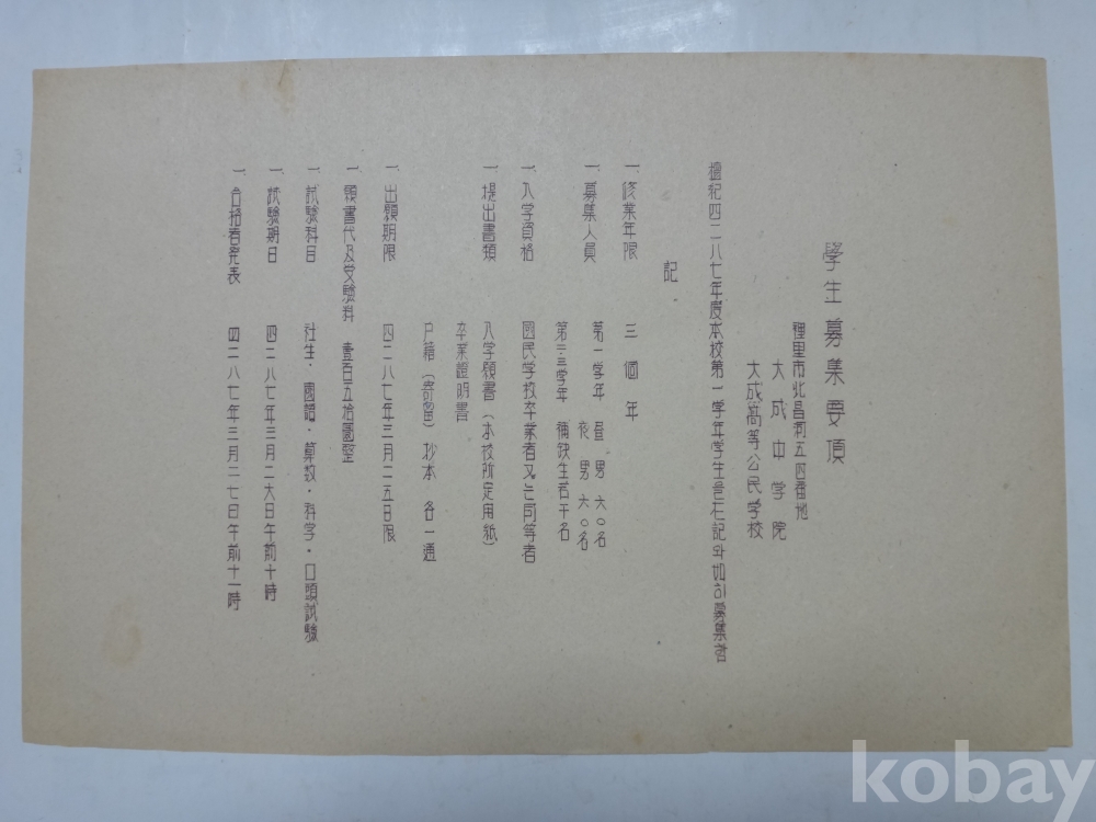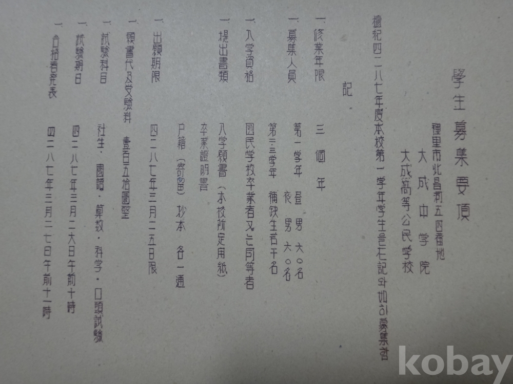 학생모집요항 - 이리시 대성중학원, 대성고등공민학교 (1954년)