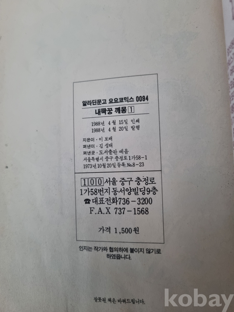내짝꿍 깨몽1 이보배 요요코믹스(도서출판예음) 1988
