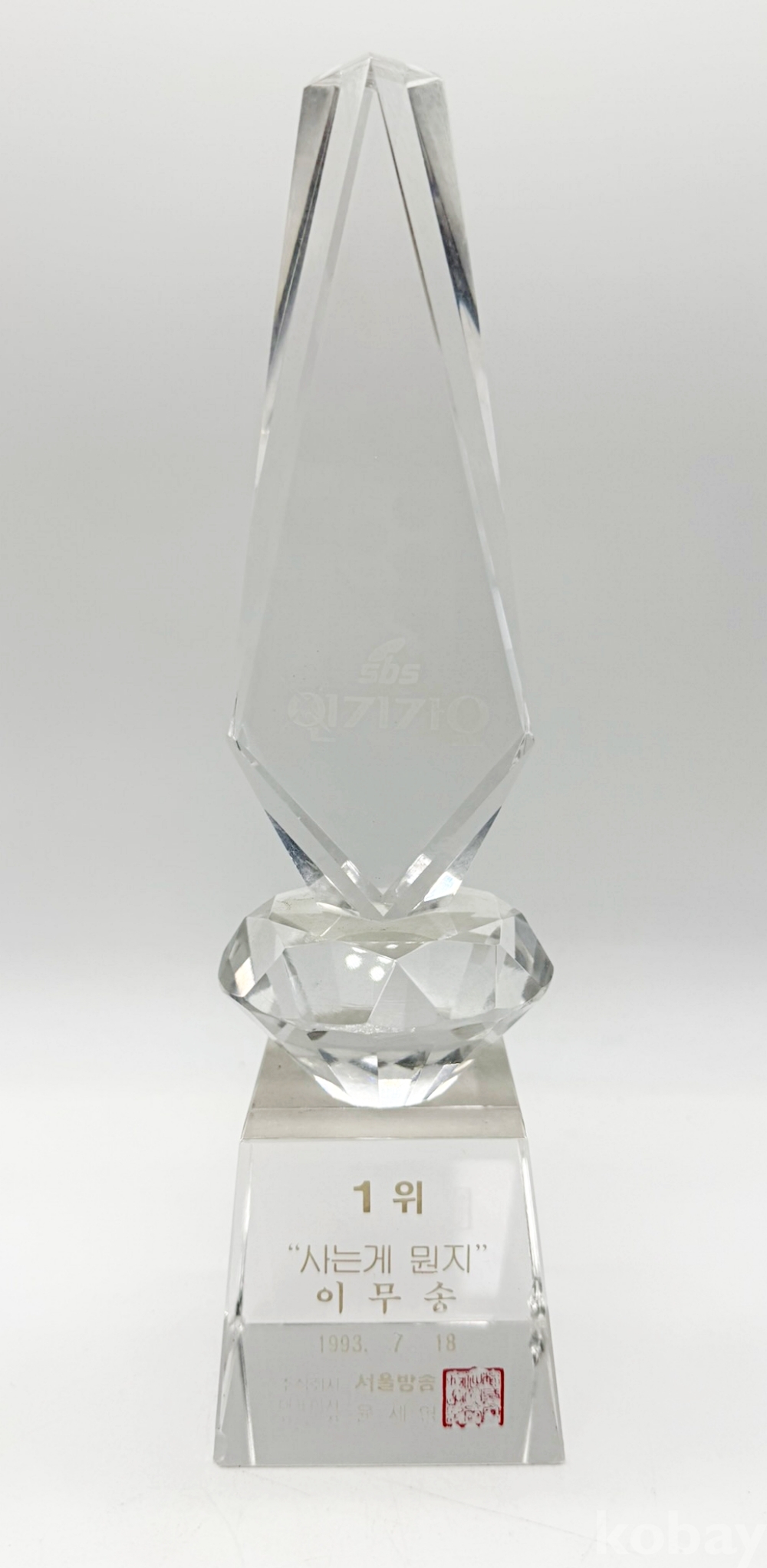 1993년 7월 셋째 주 SBS 인기가요에서 가수 이무송이 대표곡 '사는게 뭔지'로 1위를 수상하며 받은 트로피이다. 당시 이무송은 해당 곡으로 당대 최고의 가수로 자리매김 했으며, 이후에도 그의 가장 대표적인 히트곡으로 기억되고 있다. | ||