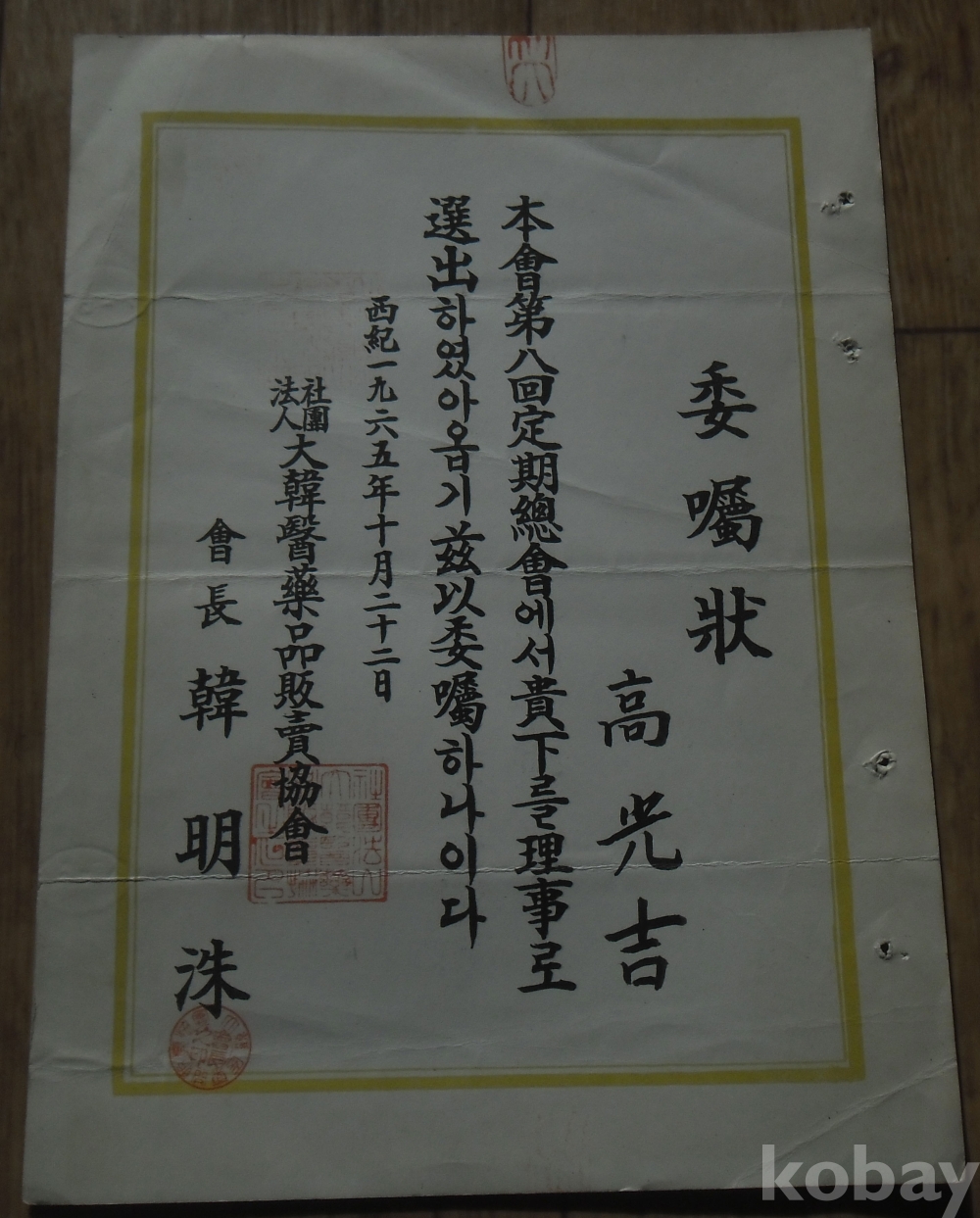 1965년 대한의약품판매협회 선출 이사 위촉장