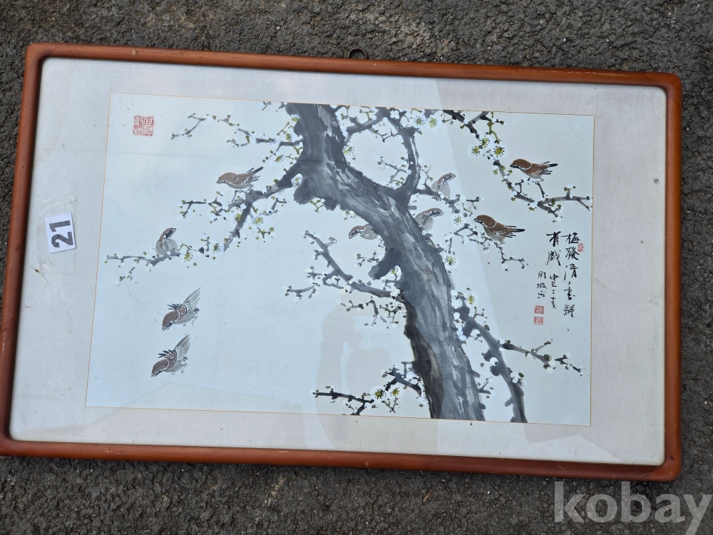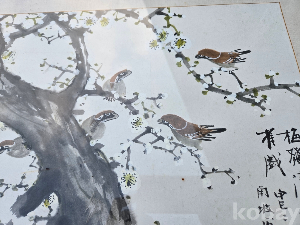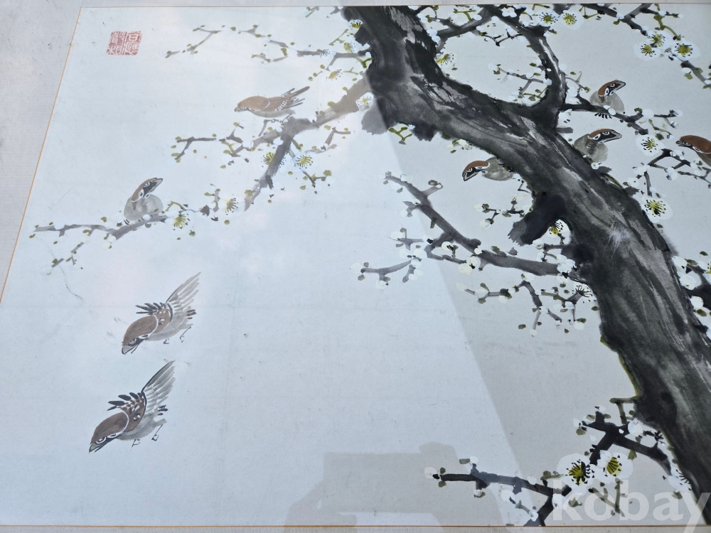 매화 꽃에 새 표현 그림 액자 입니다.