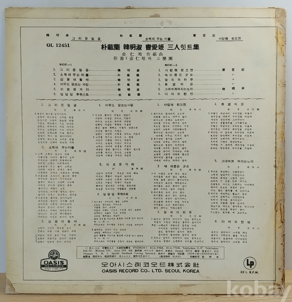 한명숙 / 조애희 / 박재란 (그리운 얼굴 / 사랑해 봤으면 / 소쩍새 우는 마을) 오아시스레코드