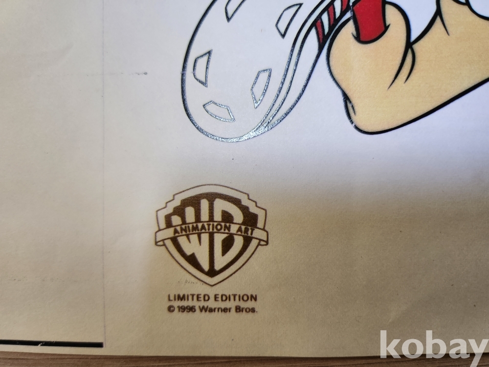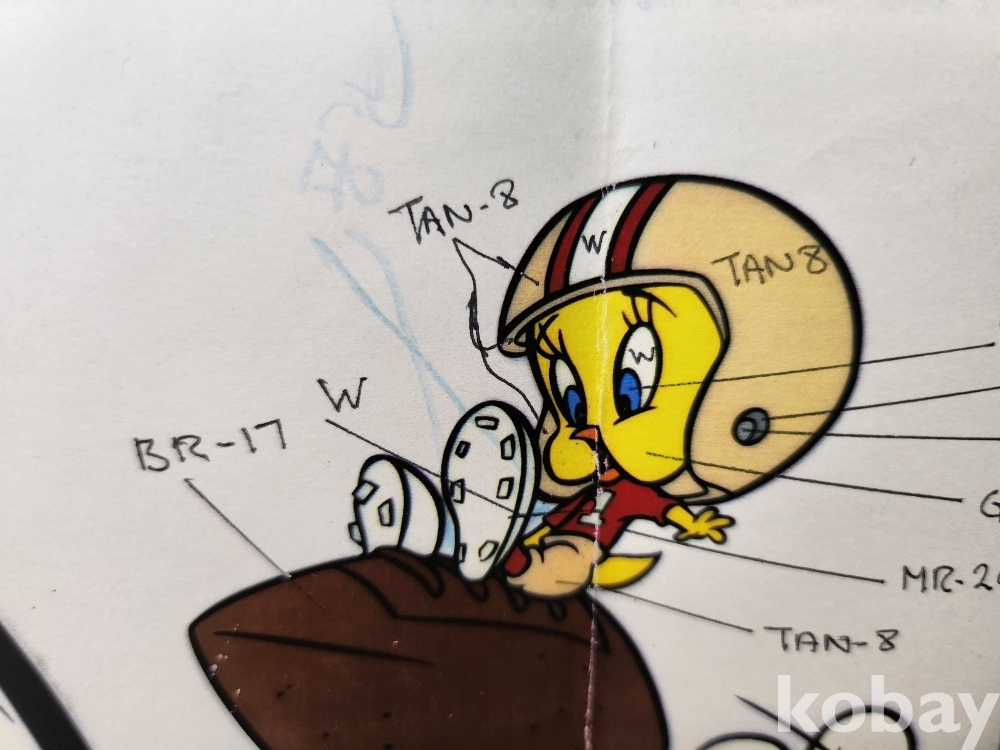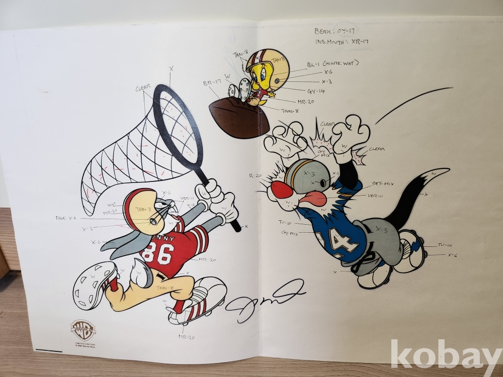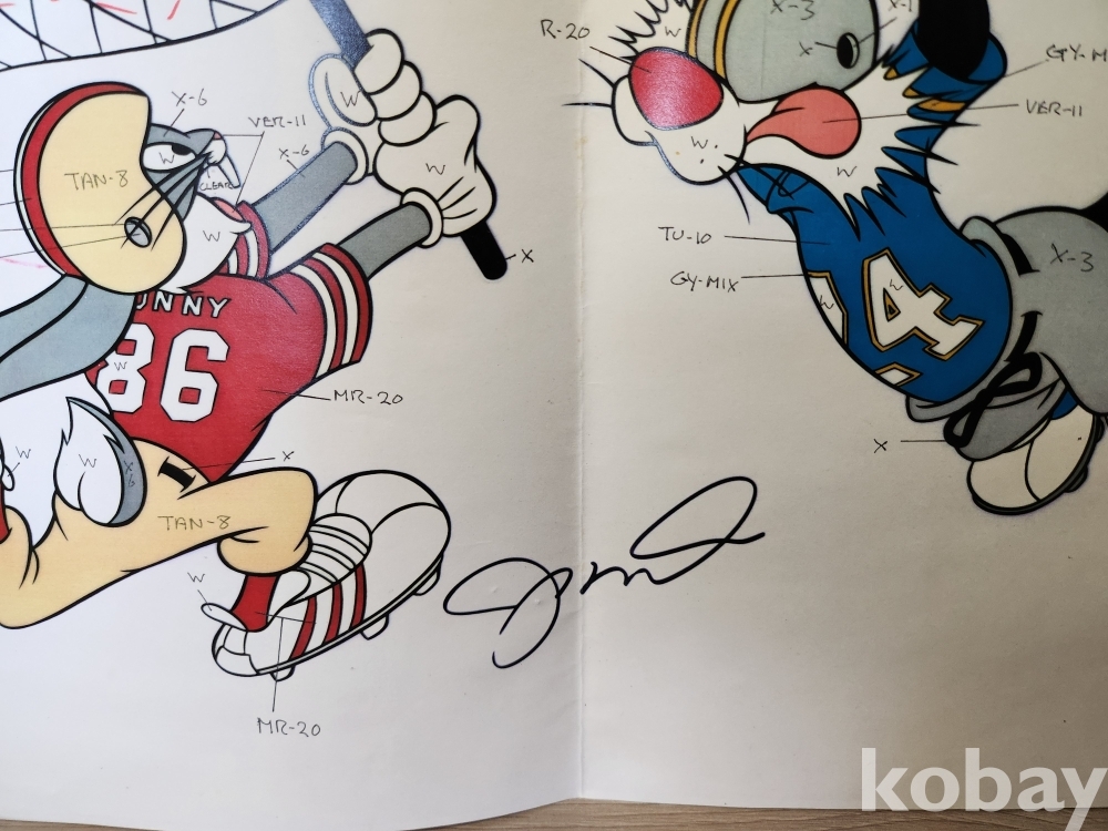 로저 래빗 캐릭터가 미식축구를 하는 장면을 구성한 애니메이션 제작 중간 도안으로, 캐릭터 주변과 화면 전반에 색상 코드 및 제작 공정 지시로 보이는 메모가 다수 기재돼 있다. 해당 도안은 워너브라더스 애니메이션 프로젝트의 제작 과정에서 사용된 자료로 보이며, 이후 실사 미식축구 선수 조 몬타나의 이미지가 합성되고 배경 셀이 추가되면 완성 셀 작품으로 이어지는 제작 구조를 가진다. 화면 중앙 하단에 보이는 필기 형태의 글씨는 조 몬타나의 필기로 인식되나, 해당 필기가 직접 자필로 기재된 것인지 인쇄된 것인지는 확인이 어려운 상태로, 전체적으로 애니메이션 제작 공정 중 활용된 자료의 성격을 보여준다.