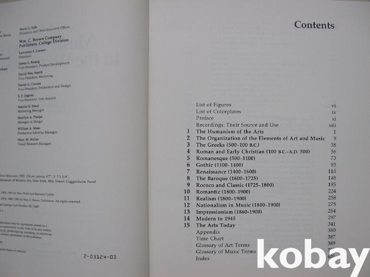 마일로는 린필드대, 에드먼드는 오레곤대학교에 있다고 내표지에 밝혔고, 초판은 1955년으로 저작권 표시가 있다. 본문은 15장에 나누어 고대부터 현재까지 음악과 미술의 역사를 개설하면서 도판으로도 작품을 보여준다. 뒤 면지 사이에 셀로판 음반이 함께 철해져 있다(들어보지는 않았음!).