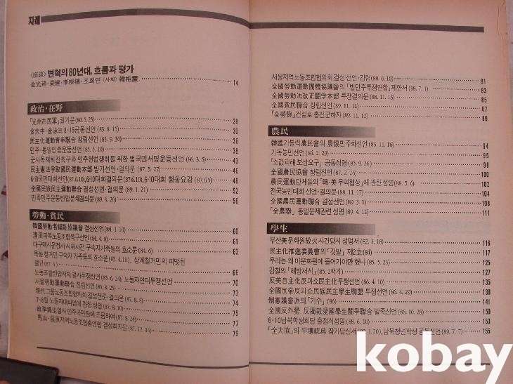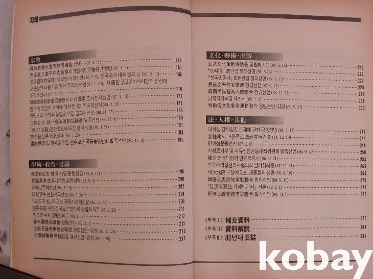 <일러두기>에 자료집을 만든 과정과 내용을 소개하였고 약칭 설명이 있다. 본문은 정치/재야, 노동/빈민, 농민, 학생, 종교, 학술/교육/언론, 문화/예술/출판, 법/인권/기타로 나누어 수록하였고, 부록으로 <자료해설>, <80년대 일지> 등을 수록하였다.