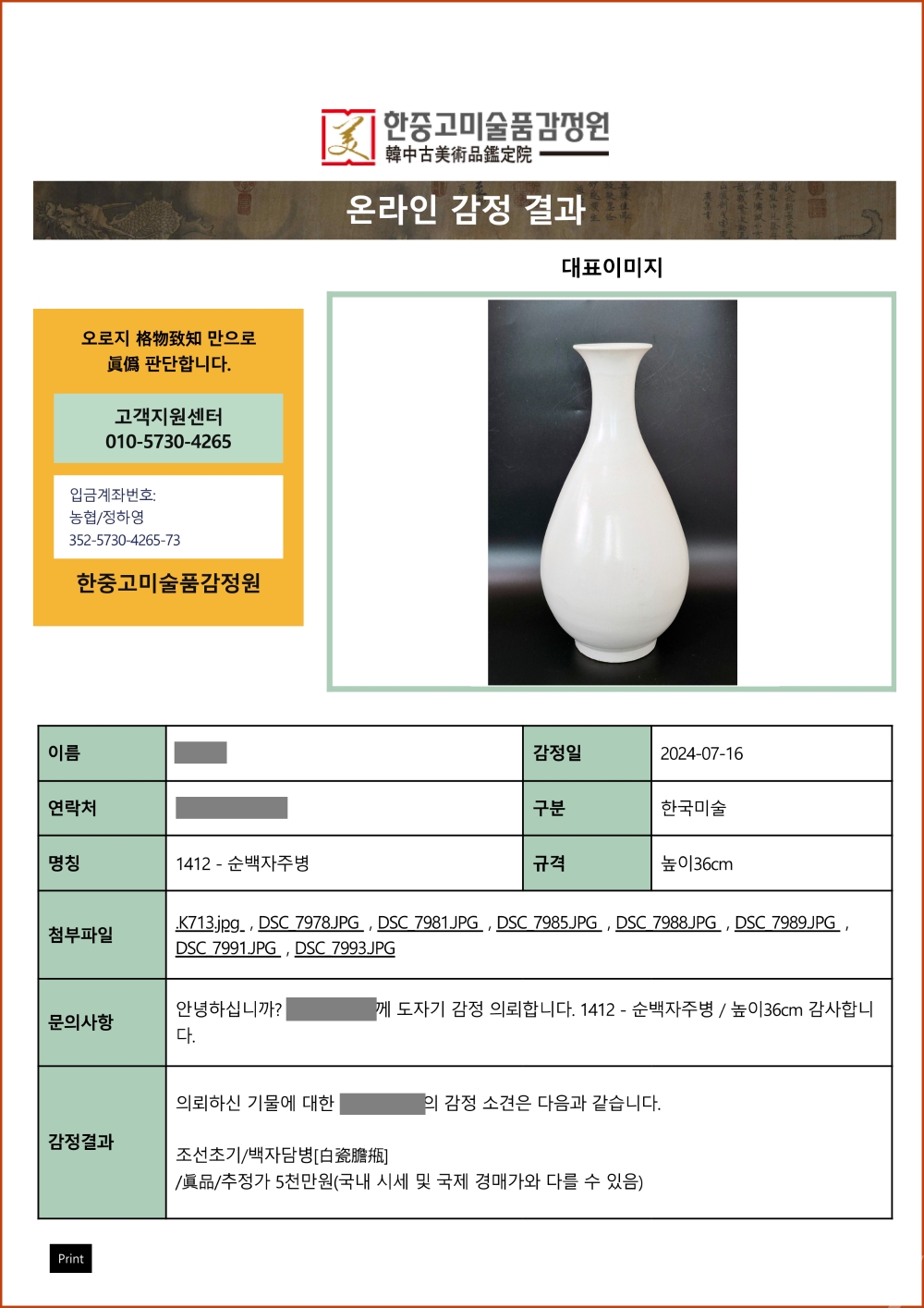 특히 기물을 받고 나서, 누구에게 보였더니 가짜라 하더라 하시며 반품하는 분들이 있는데, 이런 분들은 절대 입찰하지 마십시요.