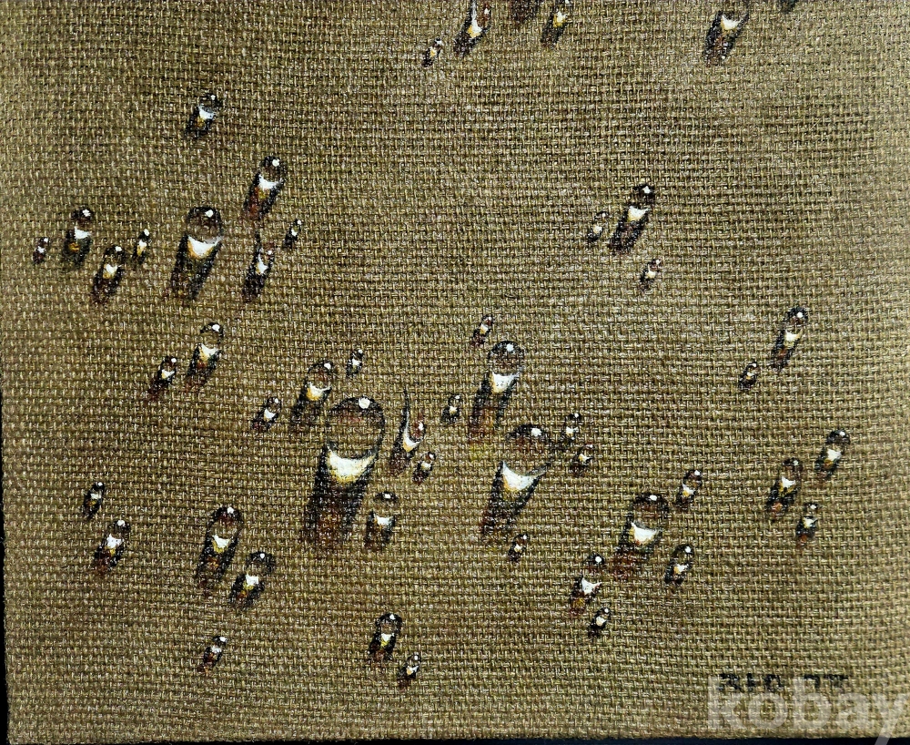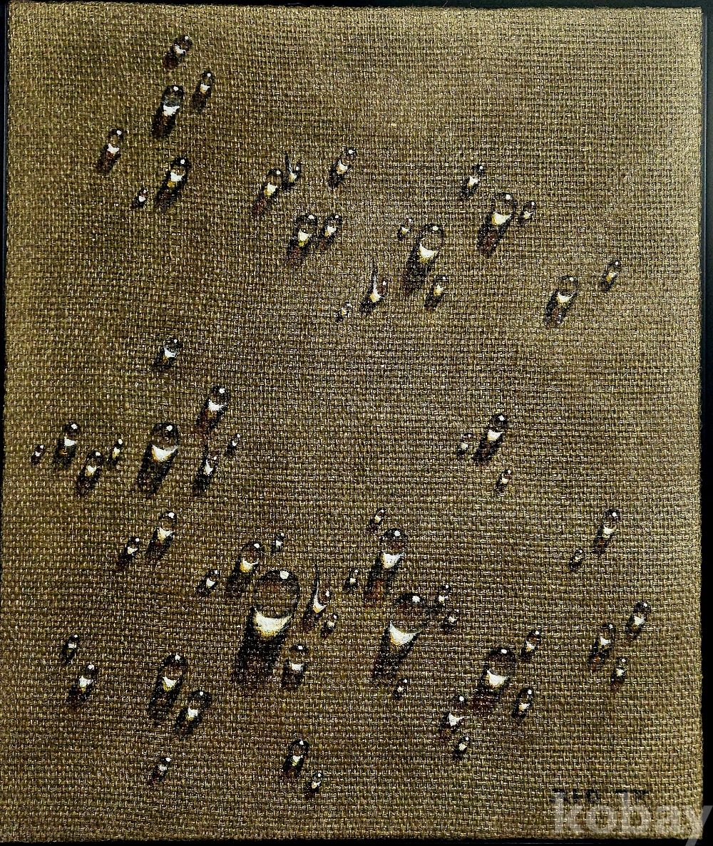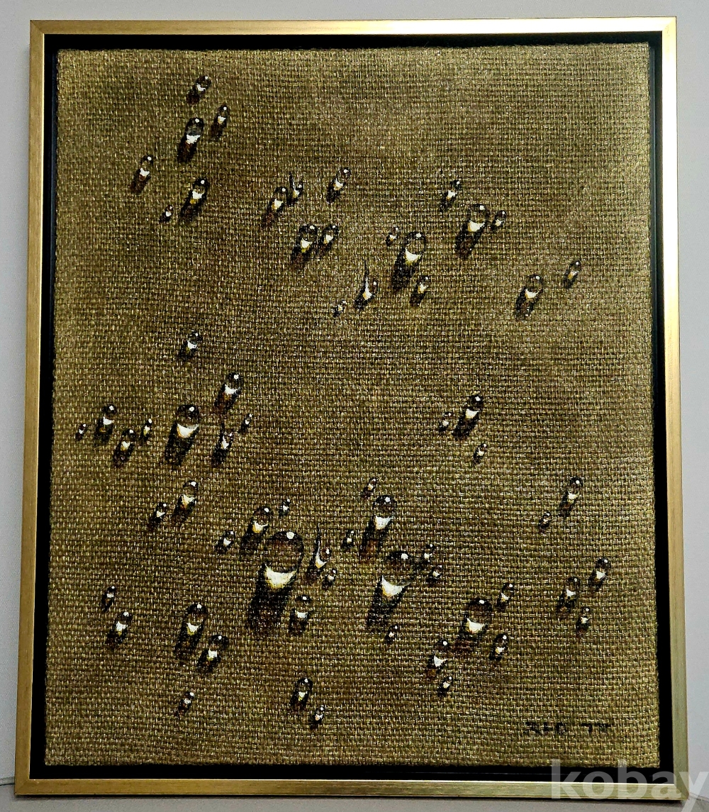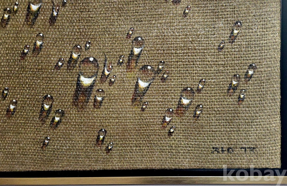 황마 캔버스위에 극사실주의 기법으로 그려진 물방울을 특징으로 합니다.
