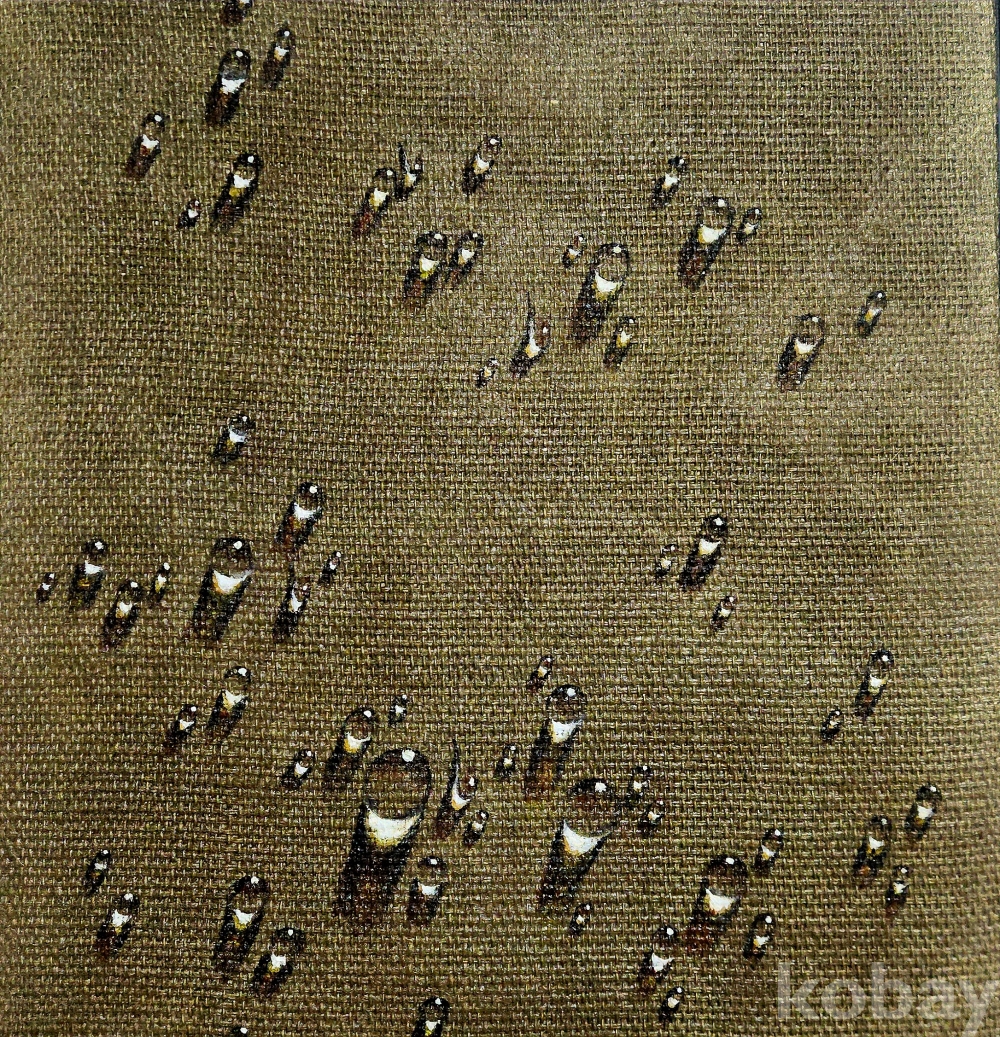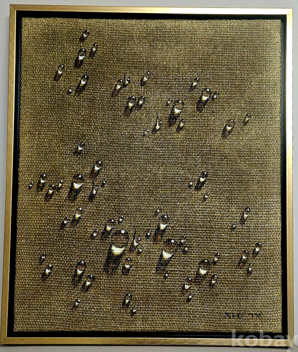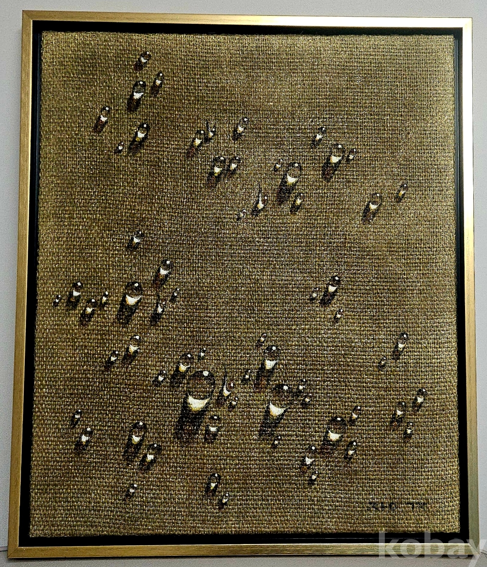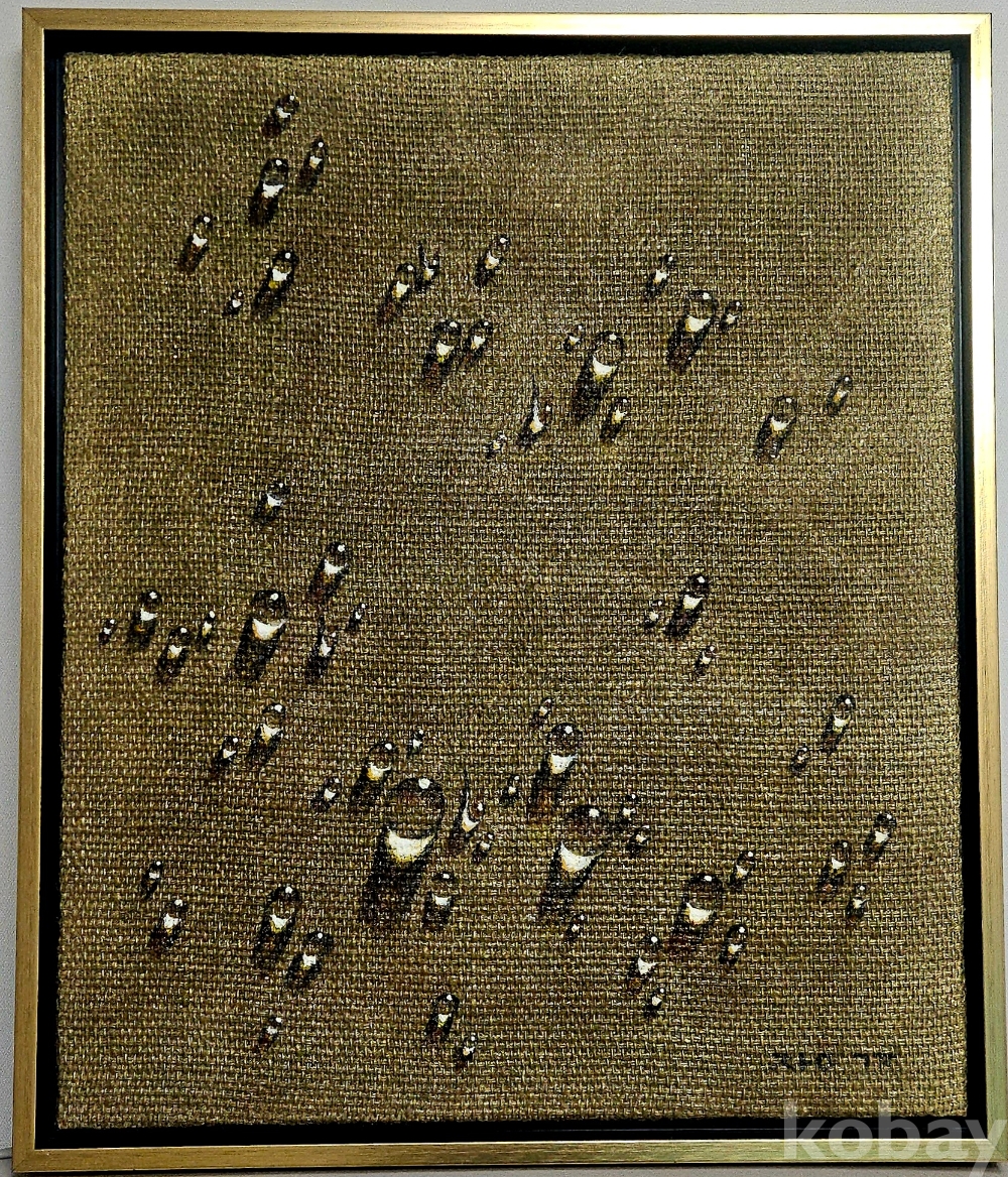 황마 캔버스위에 극사실주의 기법으로 그려진 물방울을 특징으로 합니다.