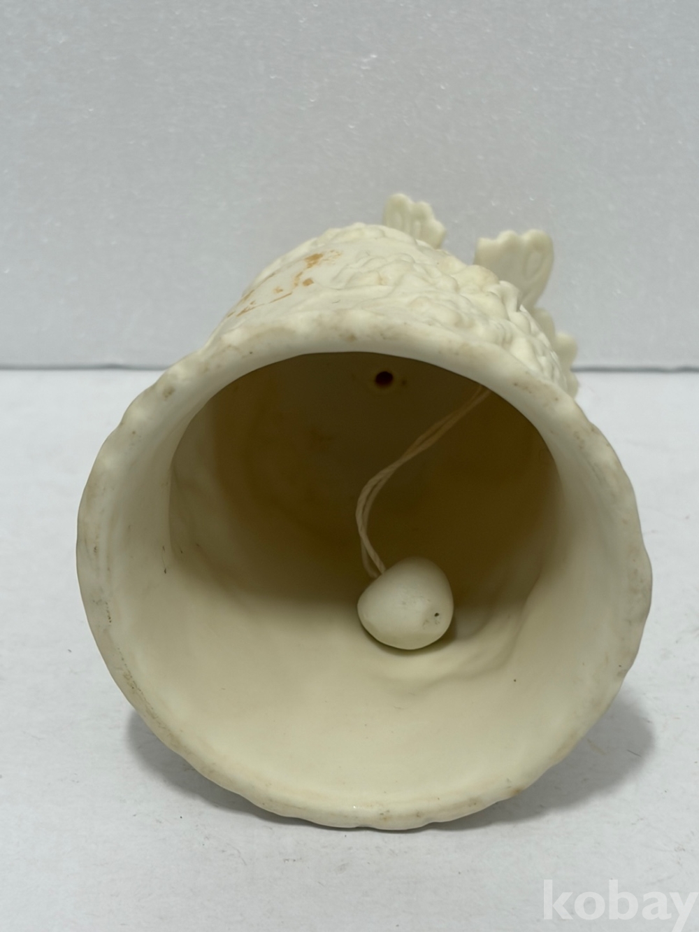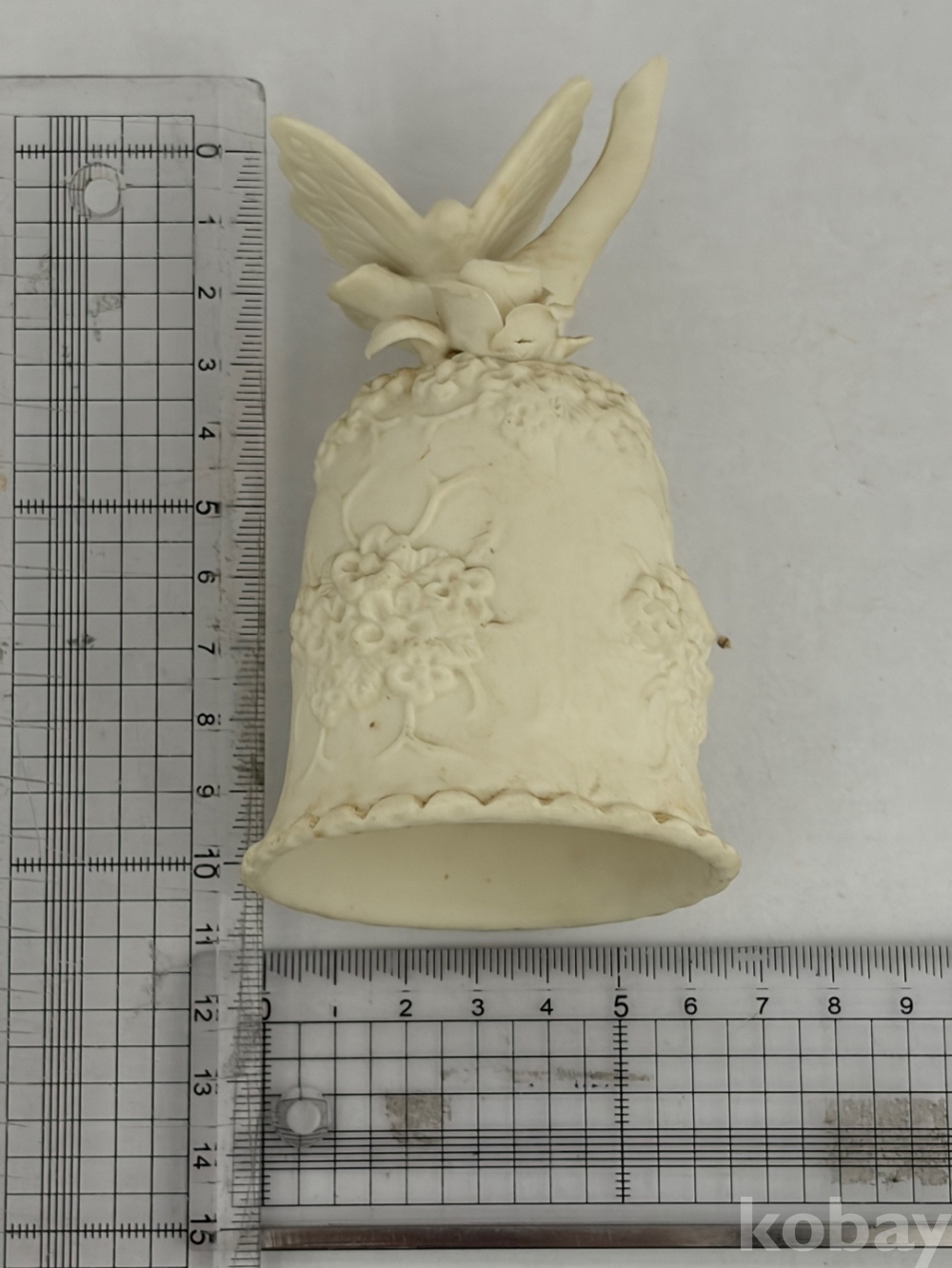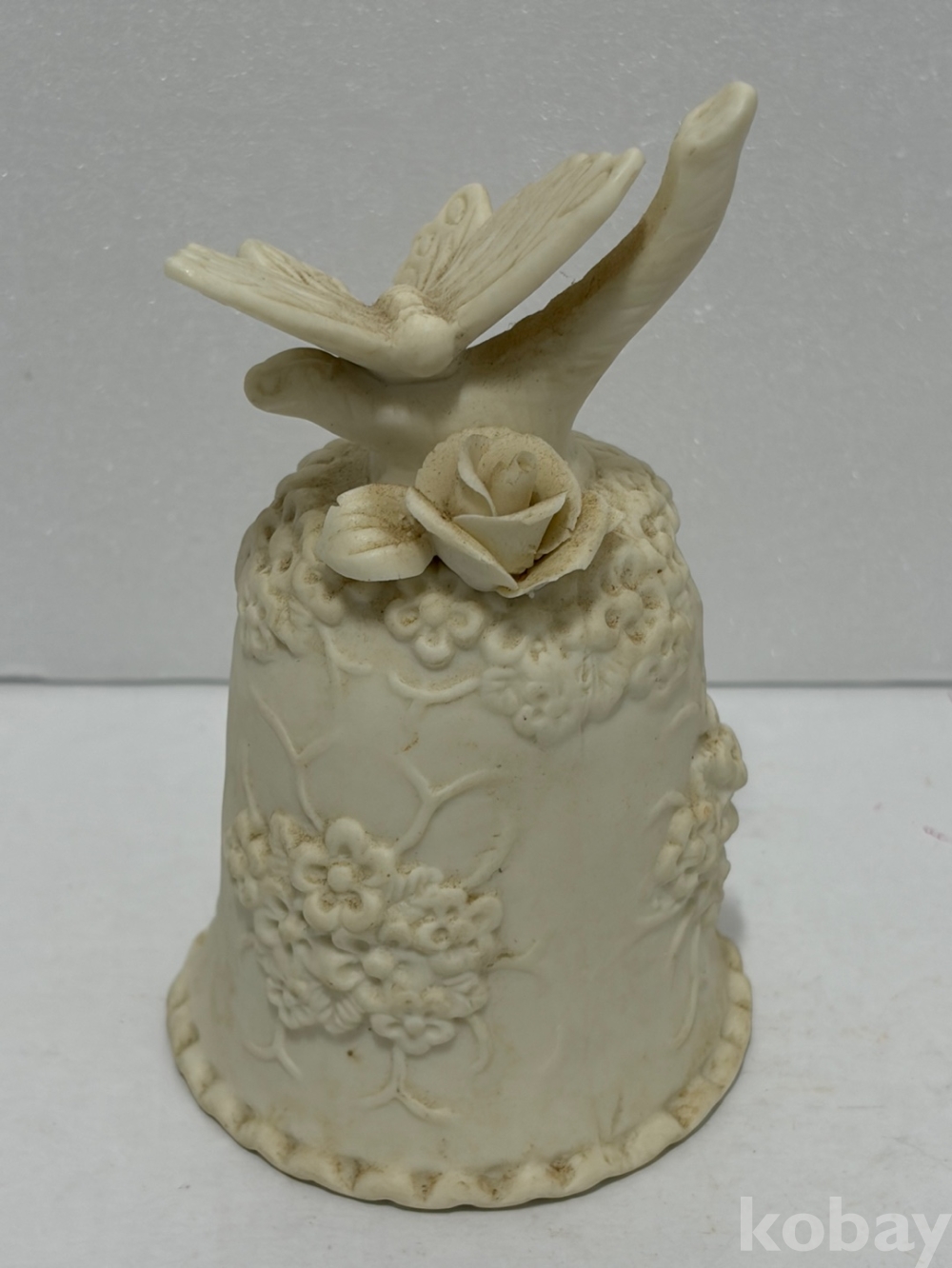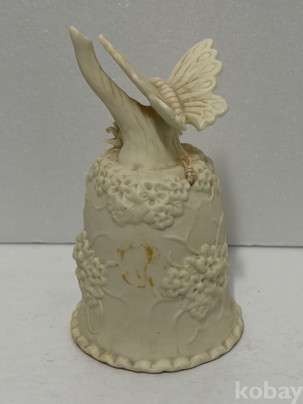 나비와 꽃 무늬가 있는 아이보리색 도자기 종입니다.
