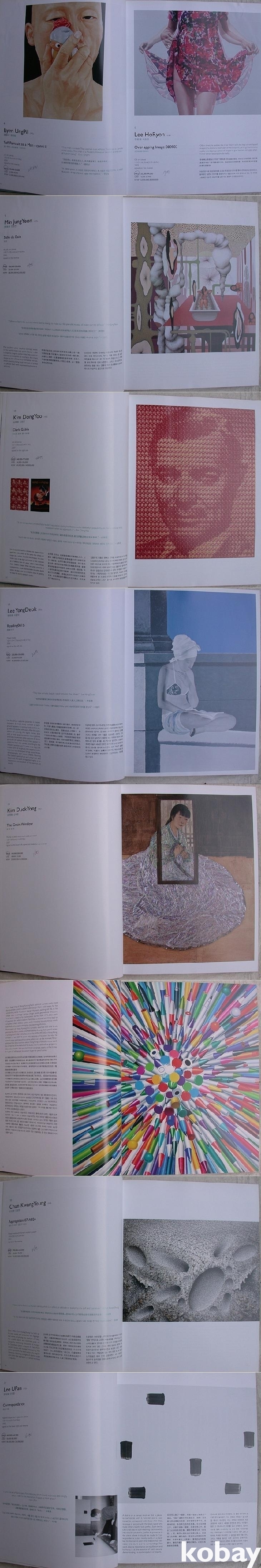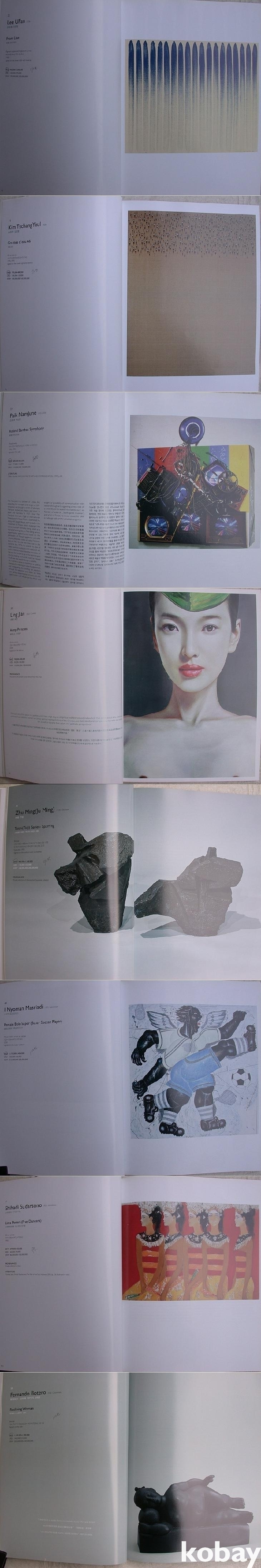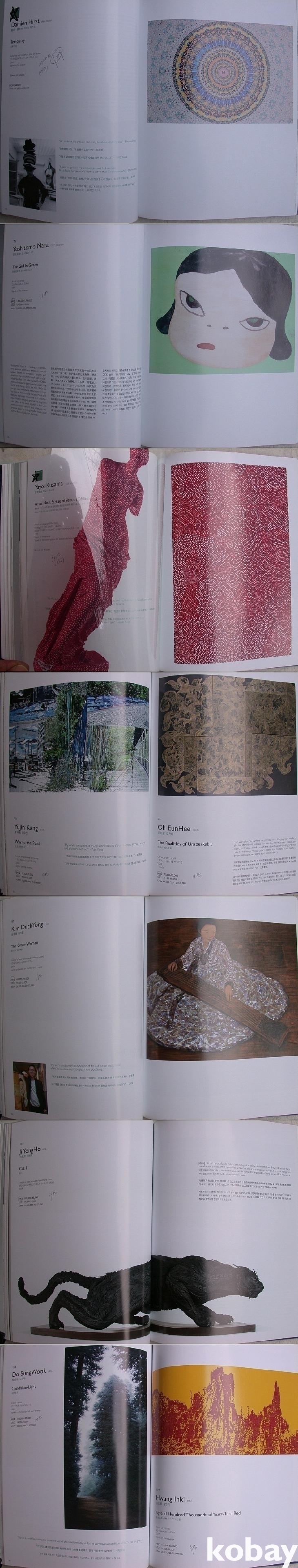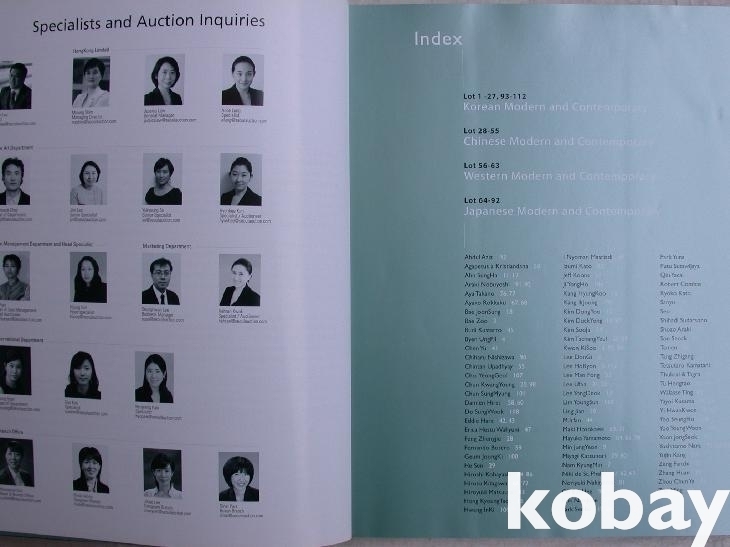 앞 차례에 작가가 알파벳 순으로 소개되어 있다. 앞뒤로 한국 현대화가 있고 중간에 중국, 서양, 일본의 현대화가 이어져 있다. 모두 112점이다. 작품마다 큰 도판과 영어 중국어 한글로 설명이 있고 끝에 작가프로필 소개가 있다. 이전 소장자가 낙찰가/유찰여부를 적어 놓았다.