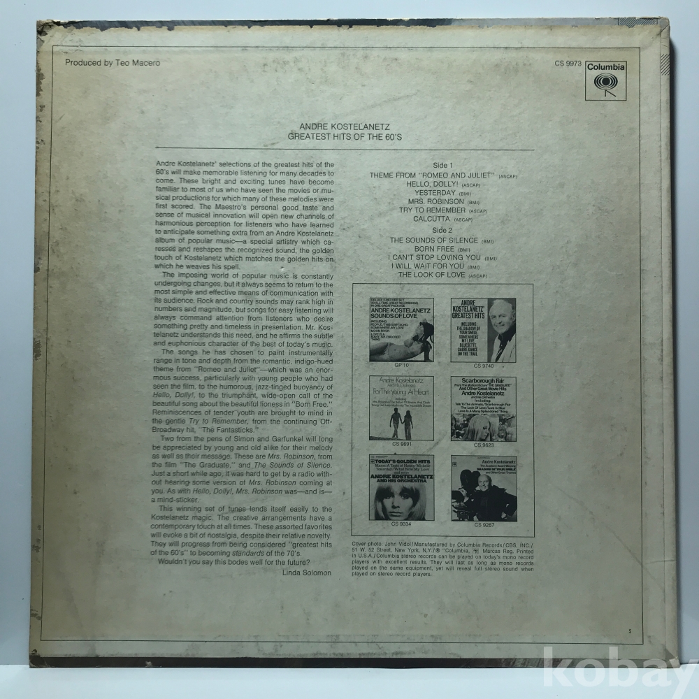 LP 29,300-158 ANDRE KOSTELANETZ Greatest Hits of The 60's . 수입 자켓 EX 알판 EX
