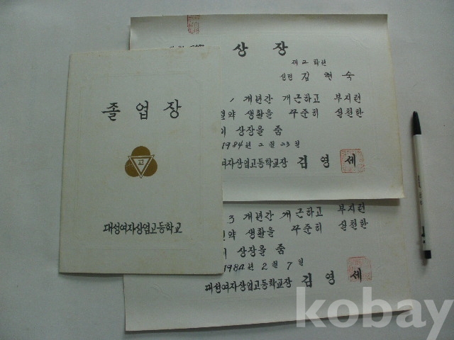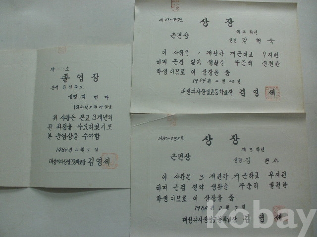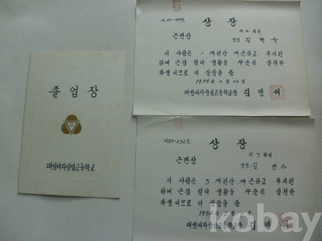 대성여상 - 졸업장, 3년간 개근상장 등 (3매일괄, 1984년)
