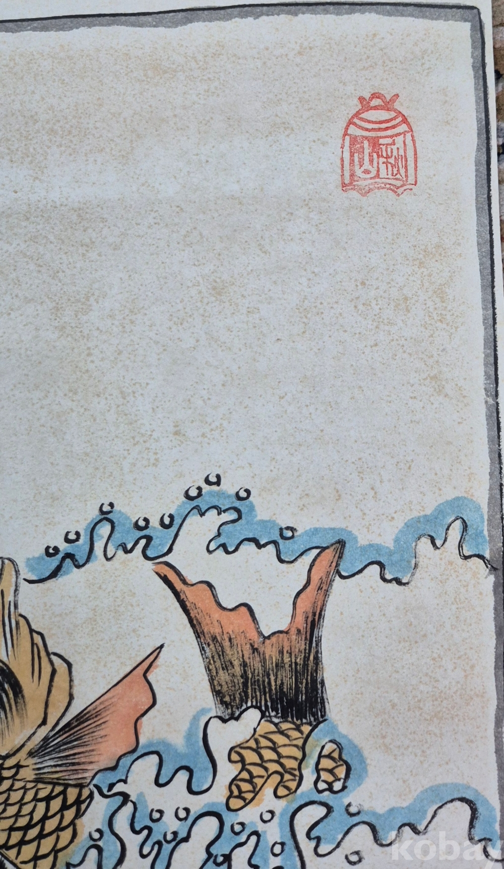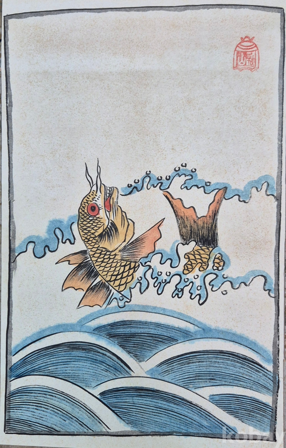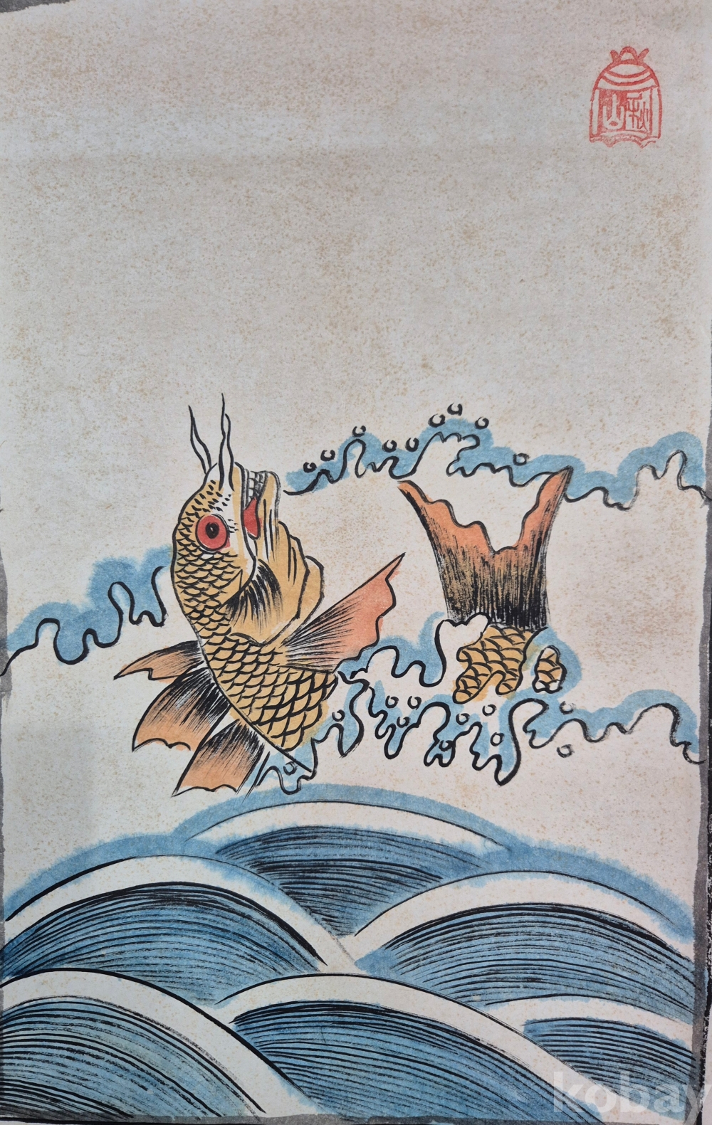 색채감 좋게 잘 그려진 입신양명을 상징하는 역동적인 잉어도'로 우측 상단 화가분 작품 추정되는