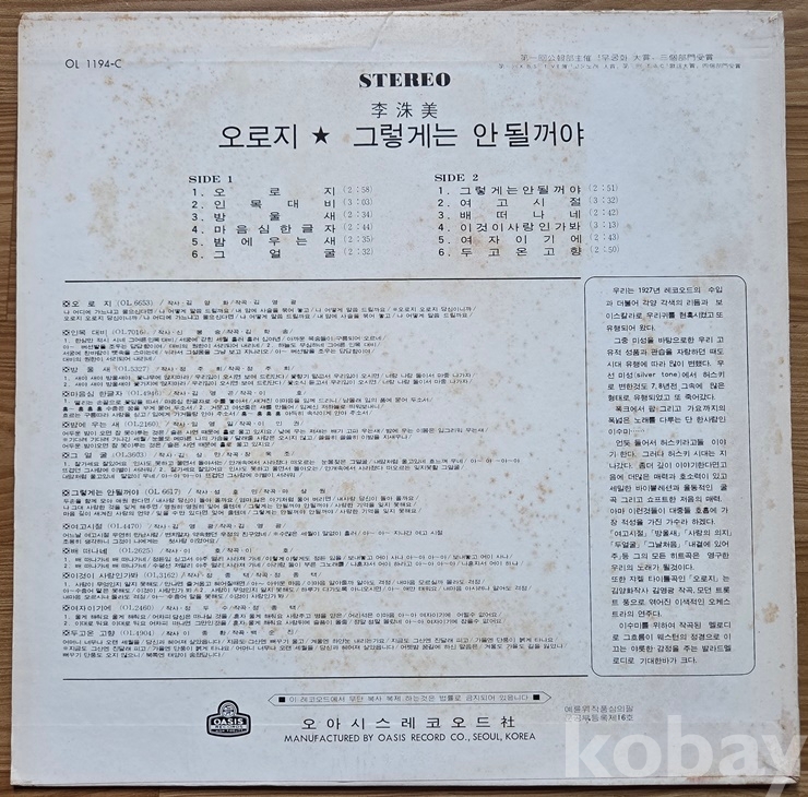 | 자켓상태 | EX : 약간의 마모, 모서리 찢김 존재 | 음반상태 | EX : 재생에 영향 없는 가벼운 기스 존재 | 발매정보 | 초반 | 가사지여부 | 유 |