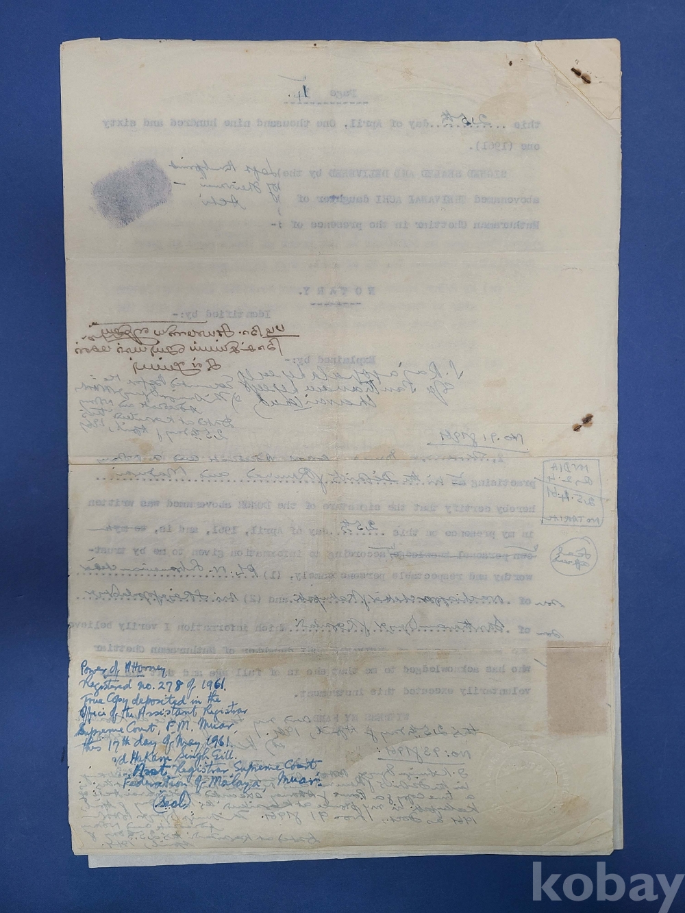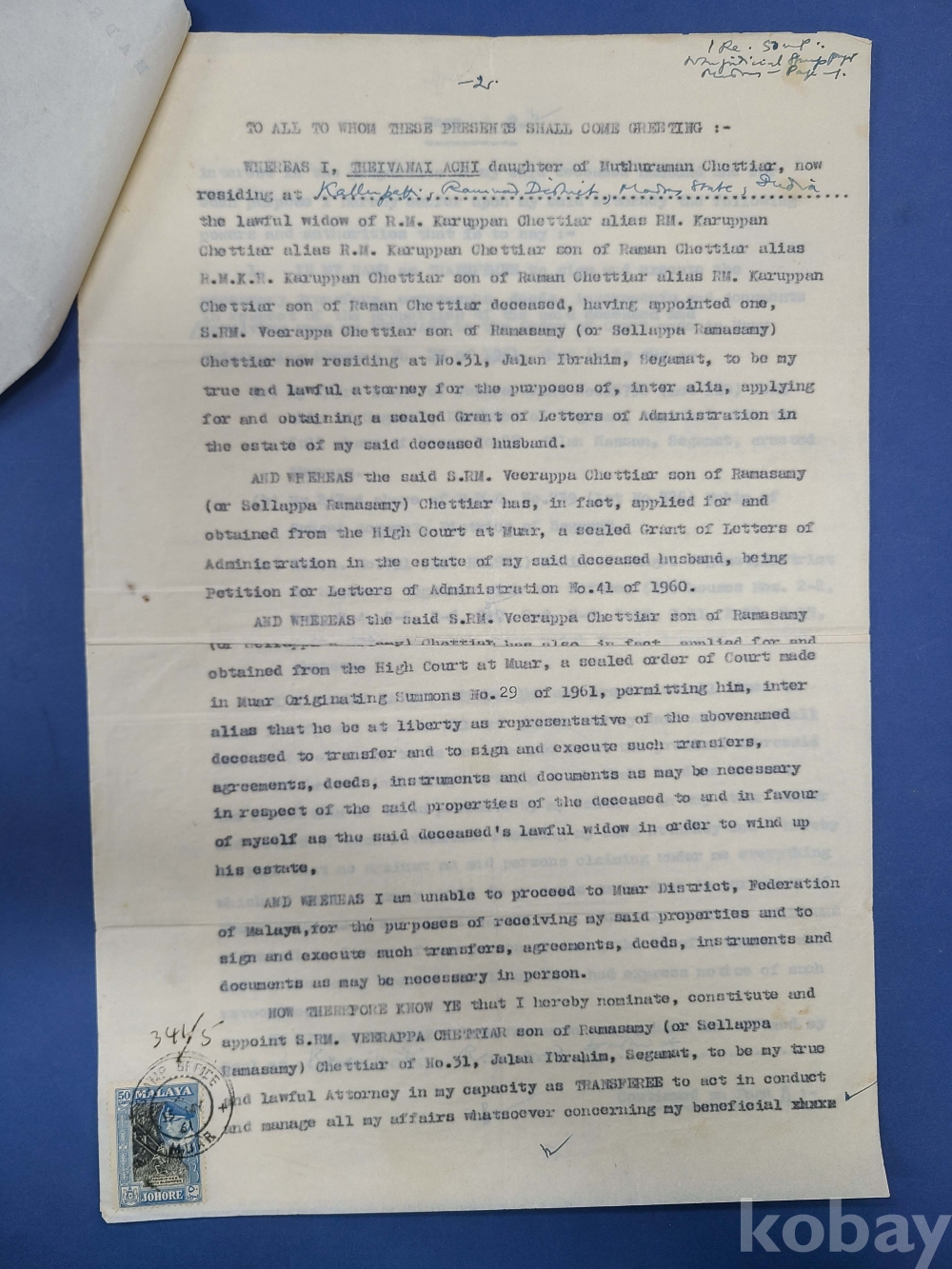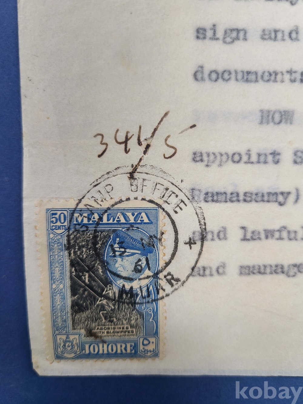 1961년 인디아 가쇄 수입인지,말라야[JOHORE] 50c 우표첩부 대형문서