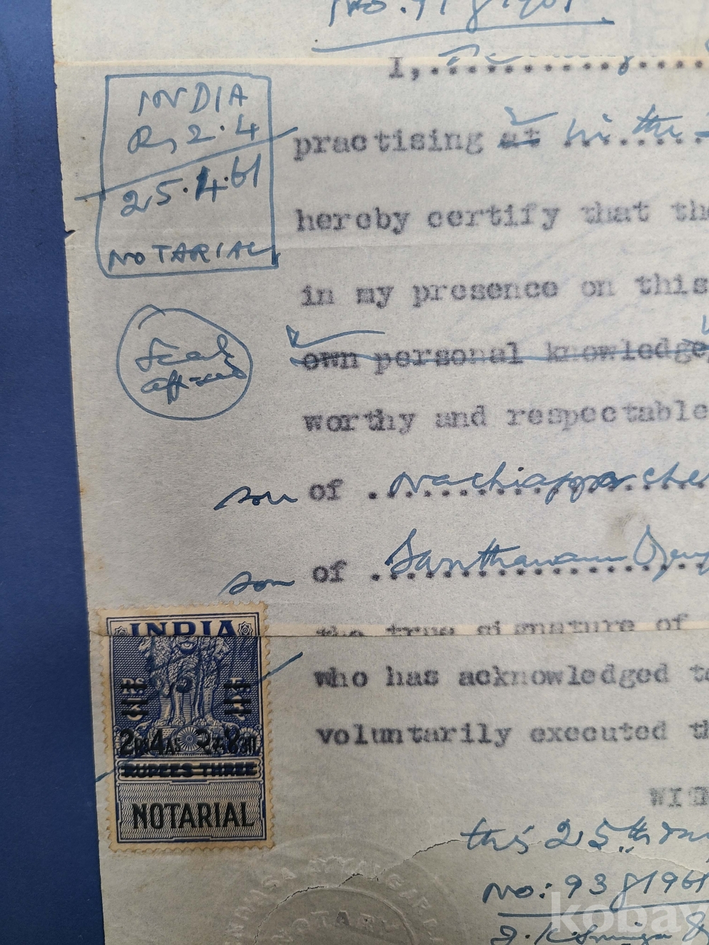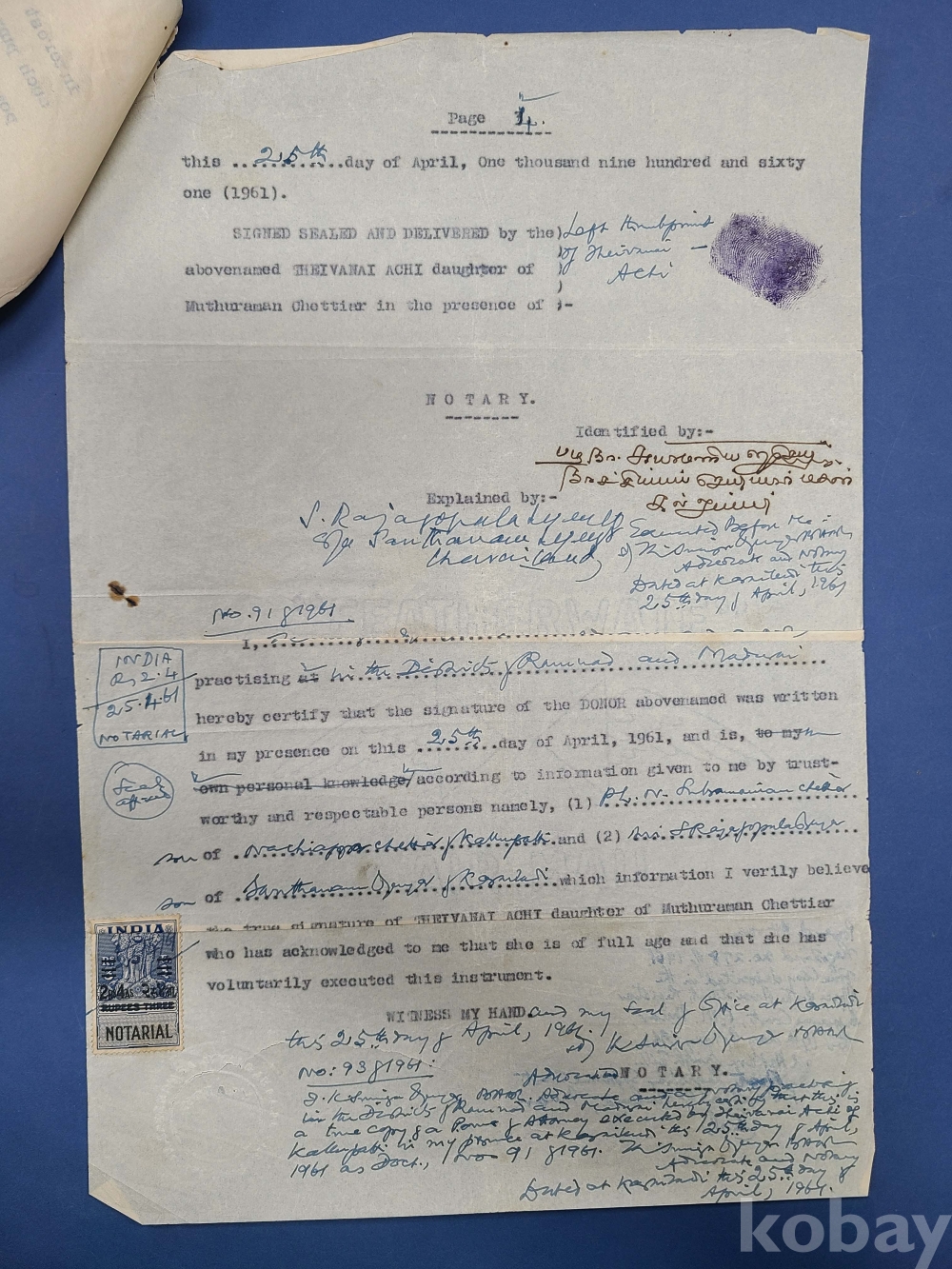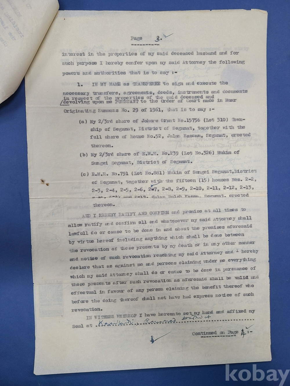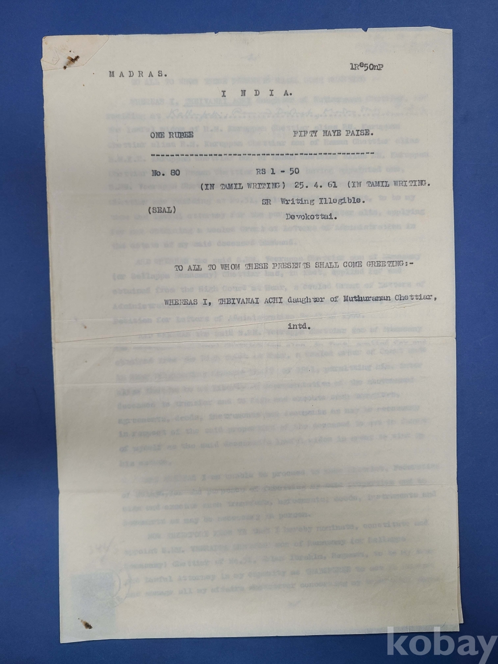 1961년 인디아 가쇄 수입인지,말라야[JOHORE] 50c 우표첩부 대형문서