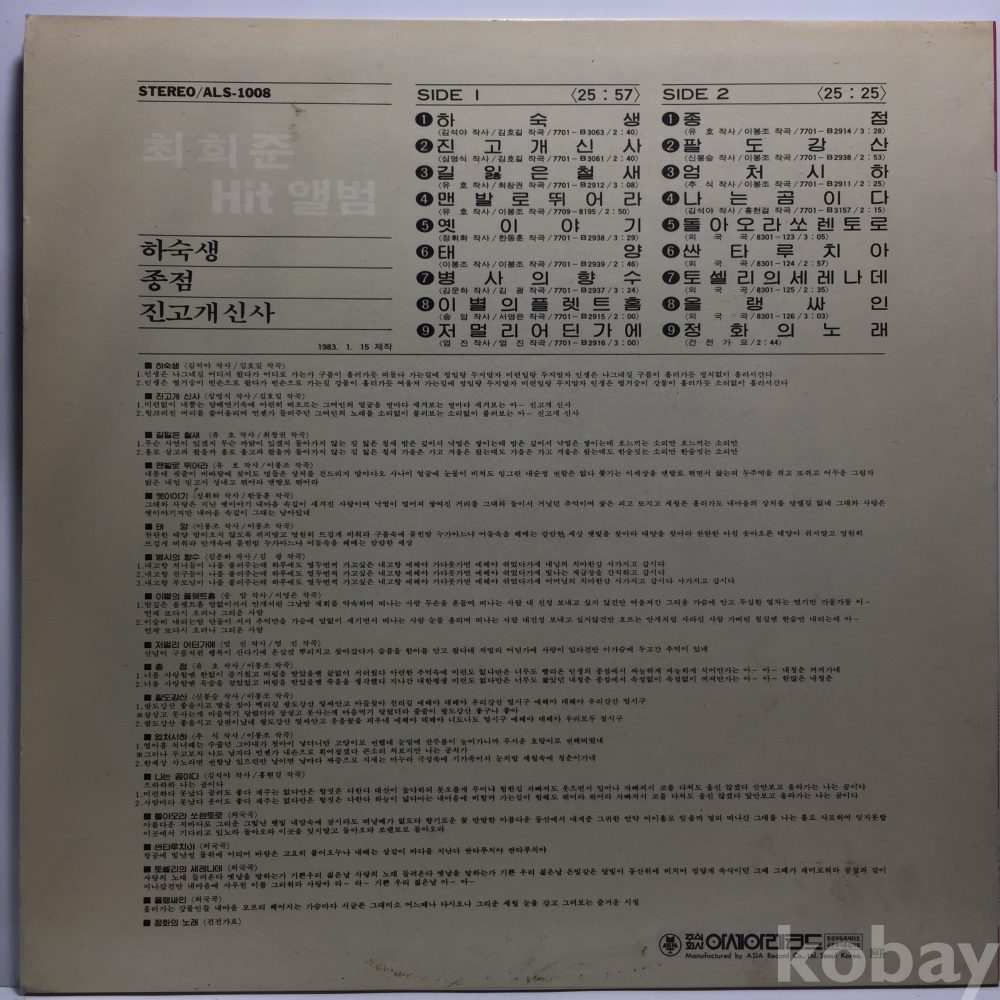 LP 350-38 최희준 히트앨범 - 하숙생/ 종점 자켓 EX+ 알판 EX EX+ 83 년 국내반