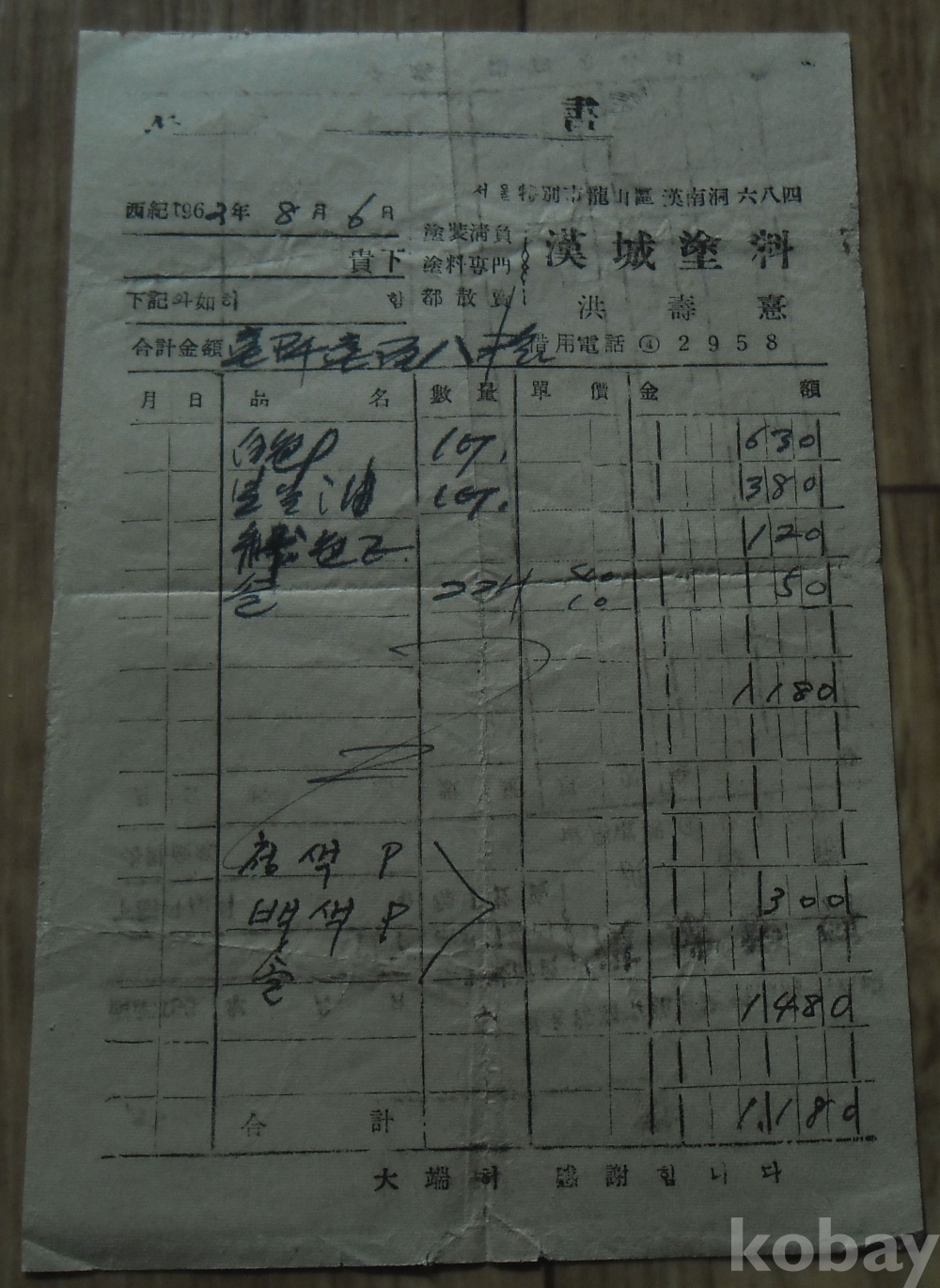 1962년 용산 한성사료 계산서