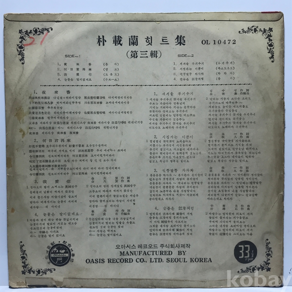 | 자켓상태 | EX : 약간의 마모, 모서리 찢김 존재 | 음반상태 | VG : 생활 기스 다수, 가벼운 노이즈 존재 | 발매정보 | 알수없음 | 가사지여부 | 무 |