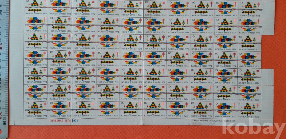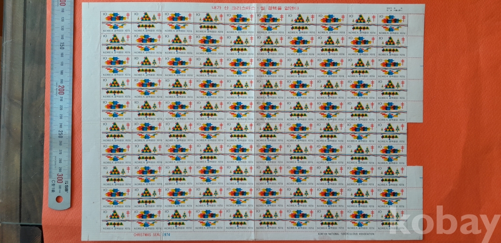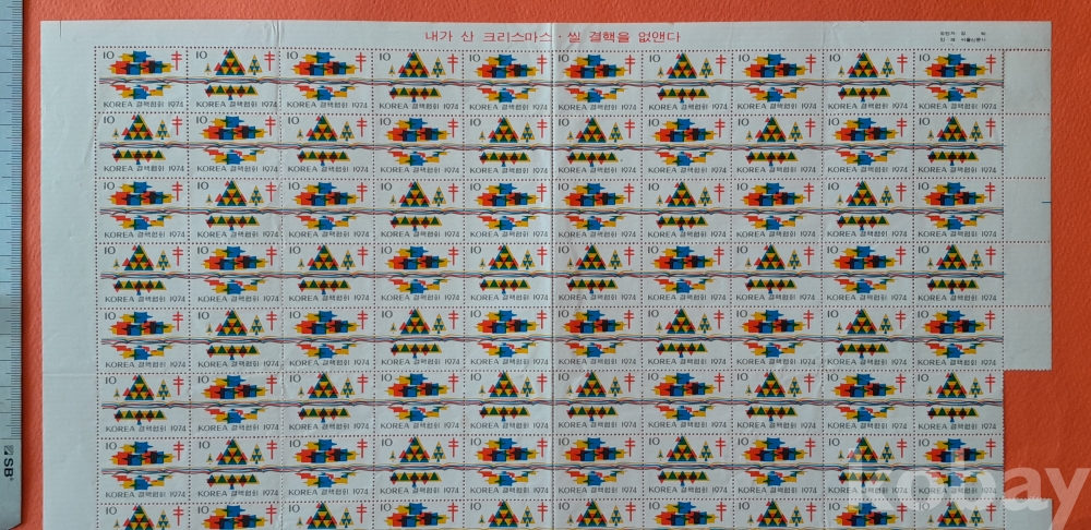 1974년 크리스마스트리와 한옥 크리스마스 씰 100매 전지 입니다.