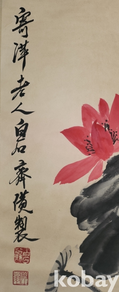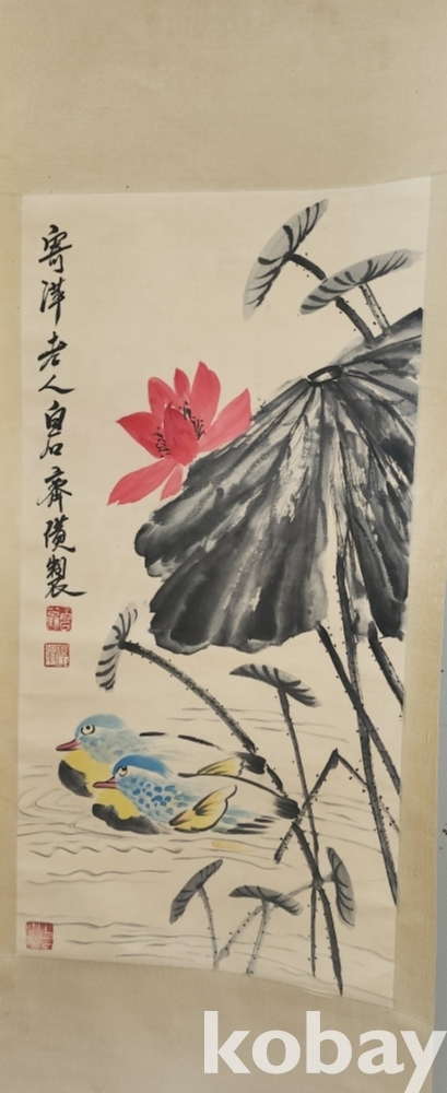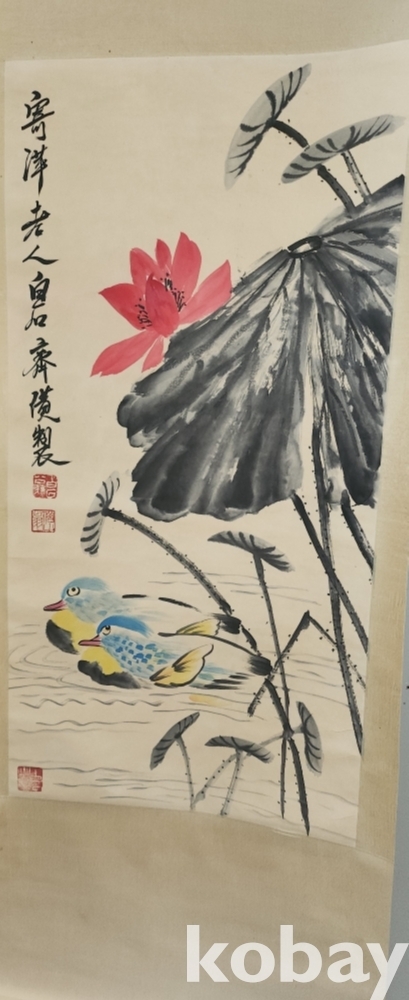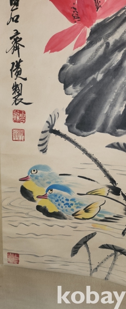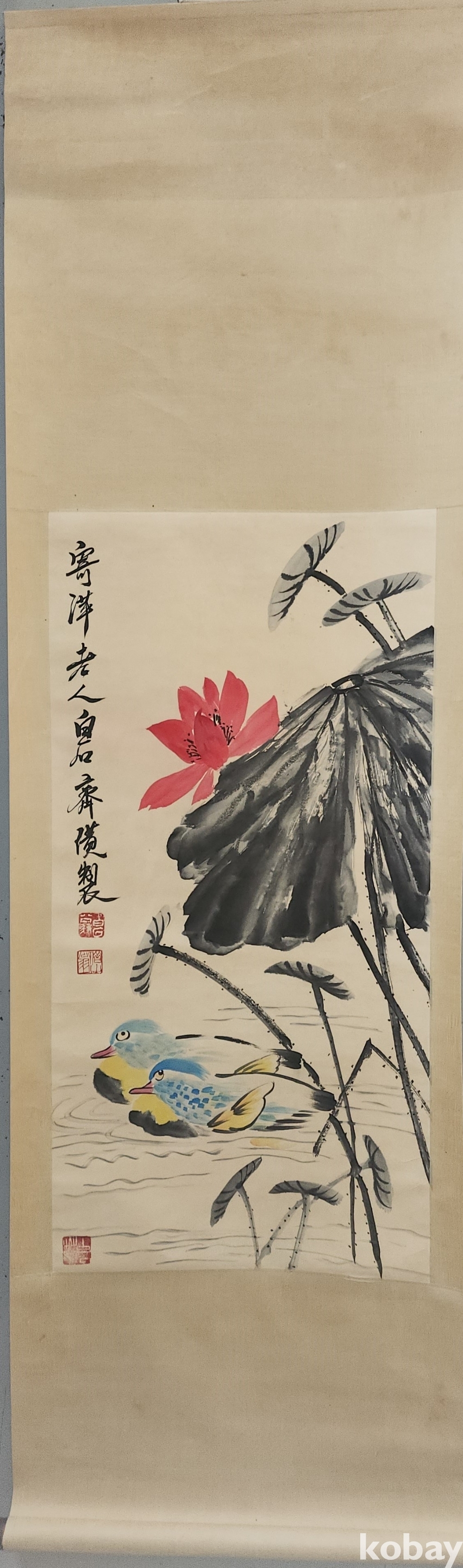 청나라 화가 제백석 ( 齊白石) 作 종이 에 채색한 연꽃과 원앙새 그림 족자입니다,