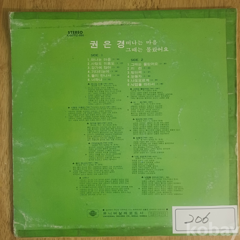 | 자켓상태 | EX : 약간의 마모, 모서리 찢김 존재 | 음반상태 | EX : 재생에 영향 없는 가벼운 기스 존재 | 발매정보 | 초반 | 가사지여부 | 무 |