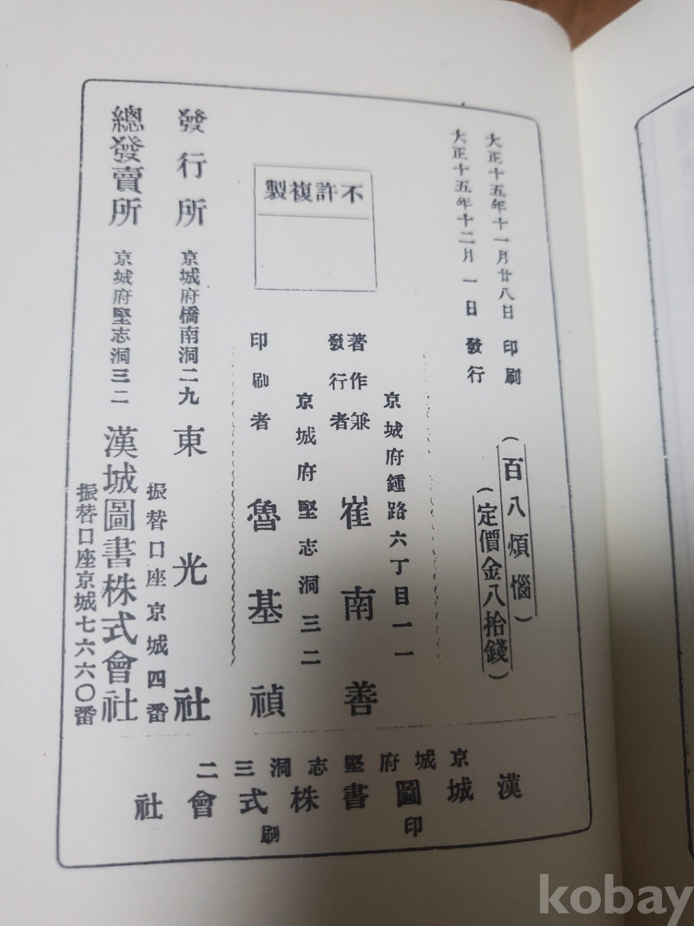 1. 백팔번뇌, 최남선, 한성도서주식회사, 1926년, 152쪽, 상태 상, 사진 참조