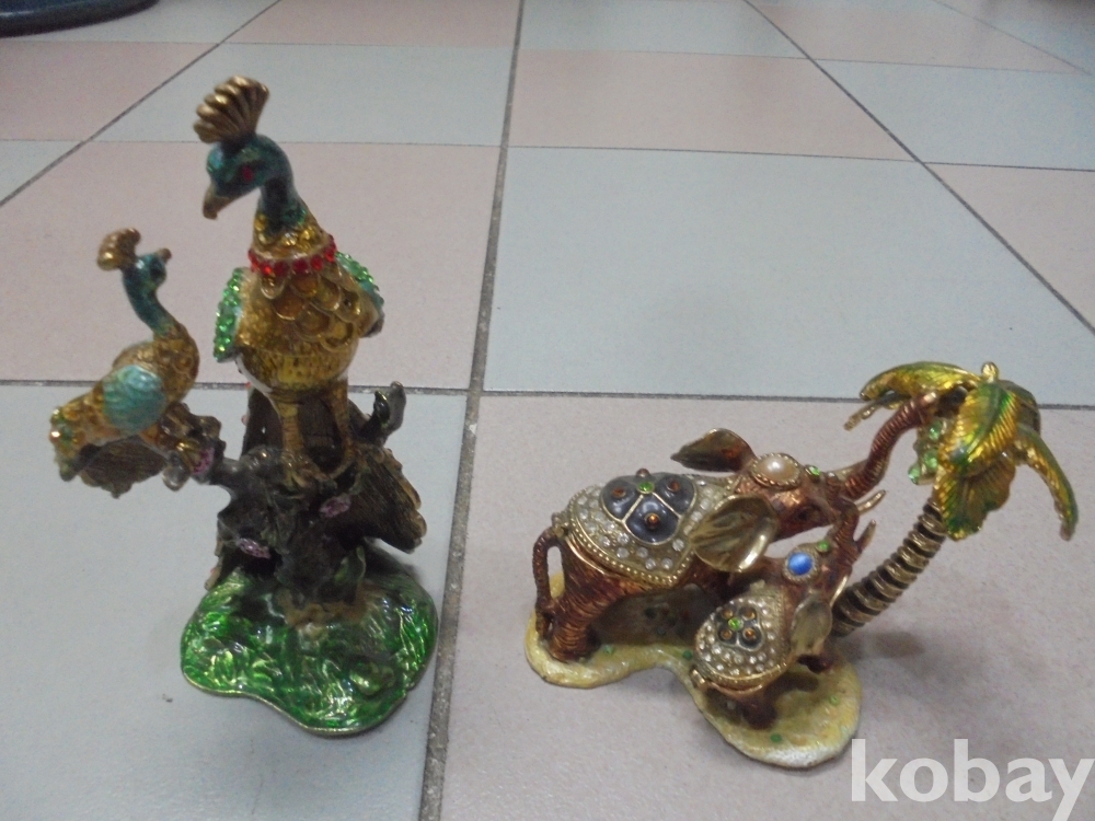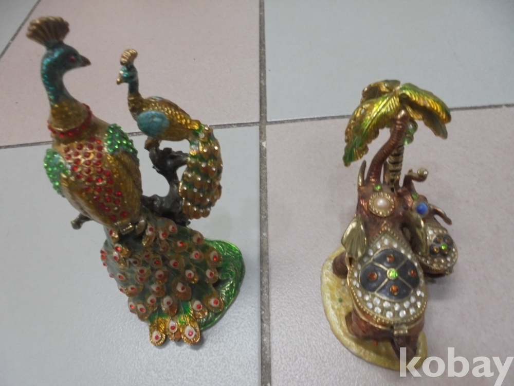 칠보와 반짝이는 보석에 화려하게 잘만든 야자수아래 어미와 새끼 코끼리 같이있는 보석함과 어미와 새끼공작 화려한 자태 칠보 보석함 총2점