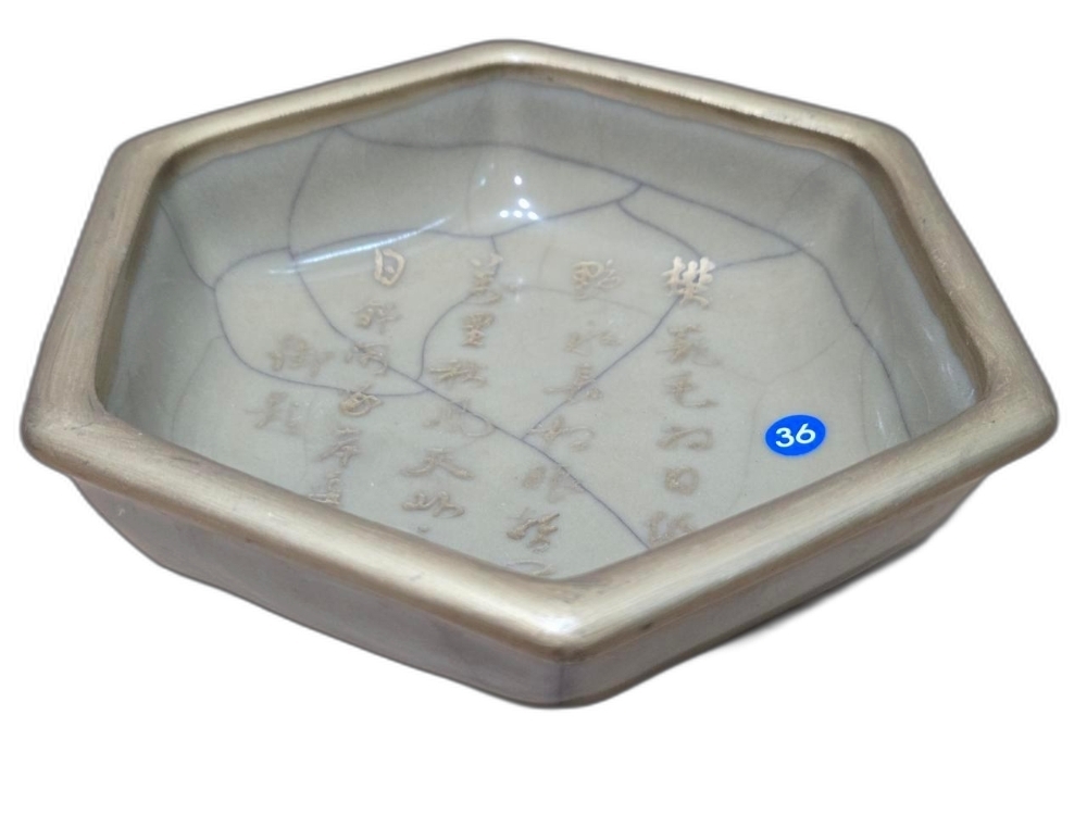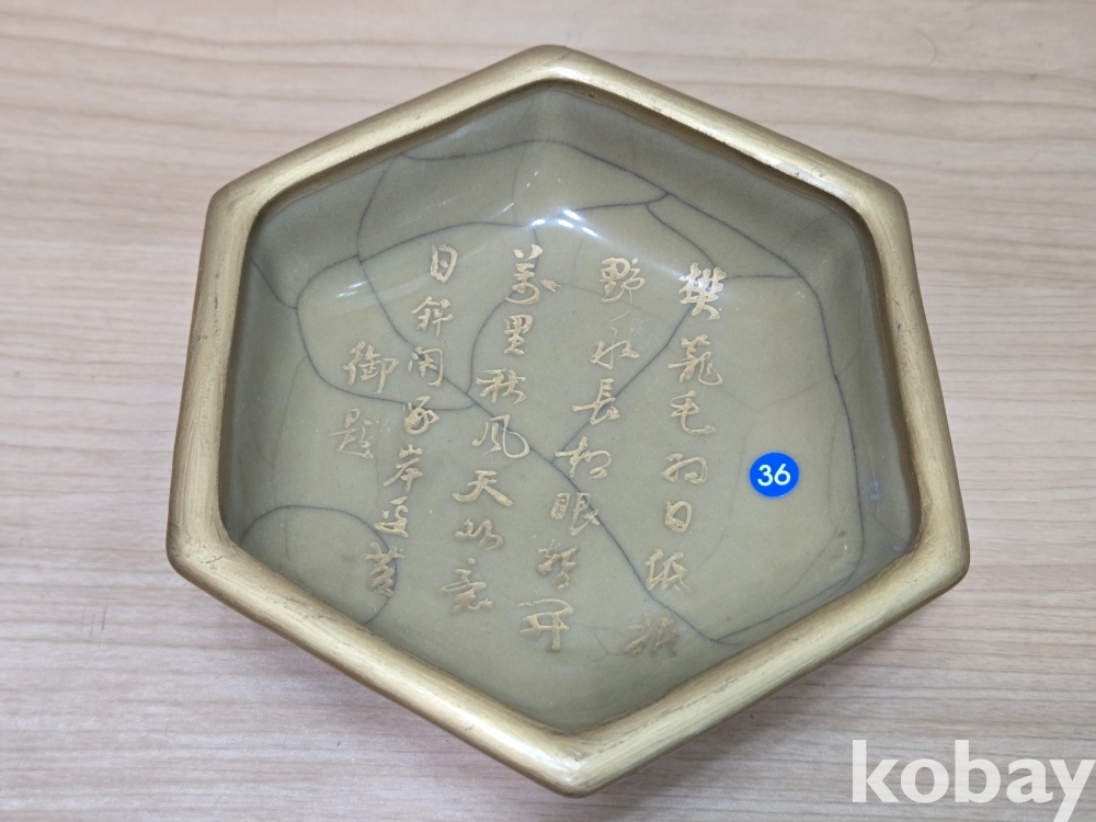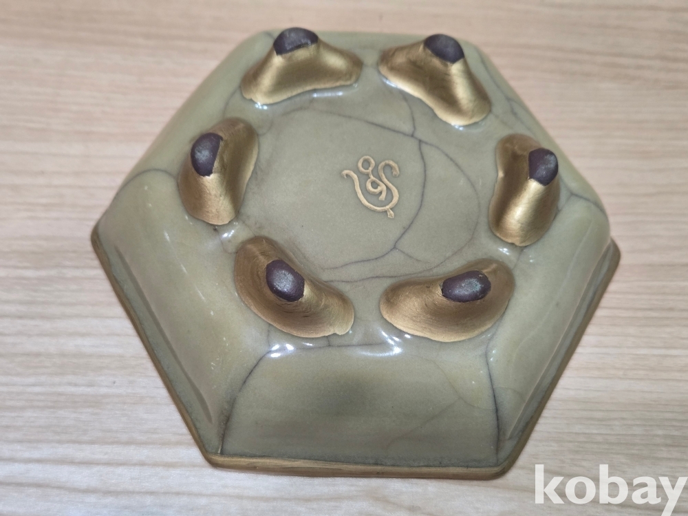 안쪽으로 글씨가 있는 6각 필새 도자기 입니다.