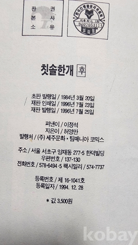 칫솔 한개, 1/2편 완결, 허영만 그림, 팀 매니아