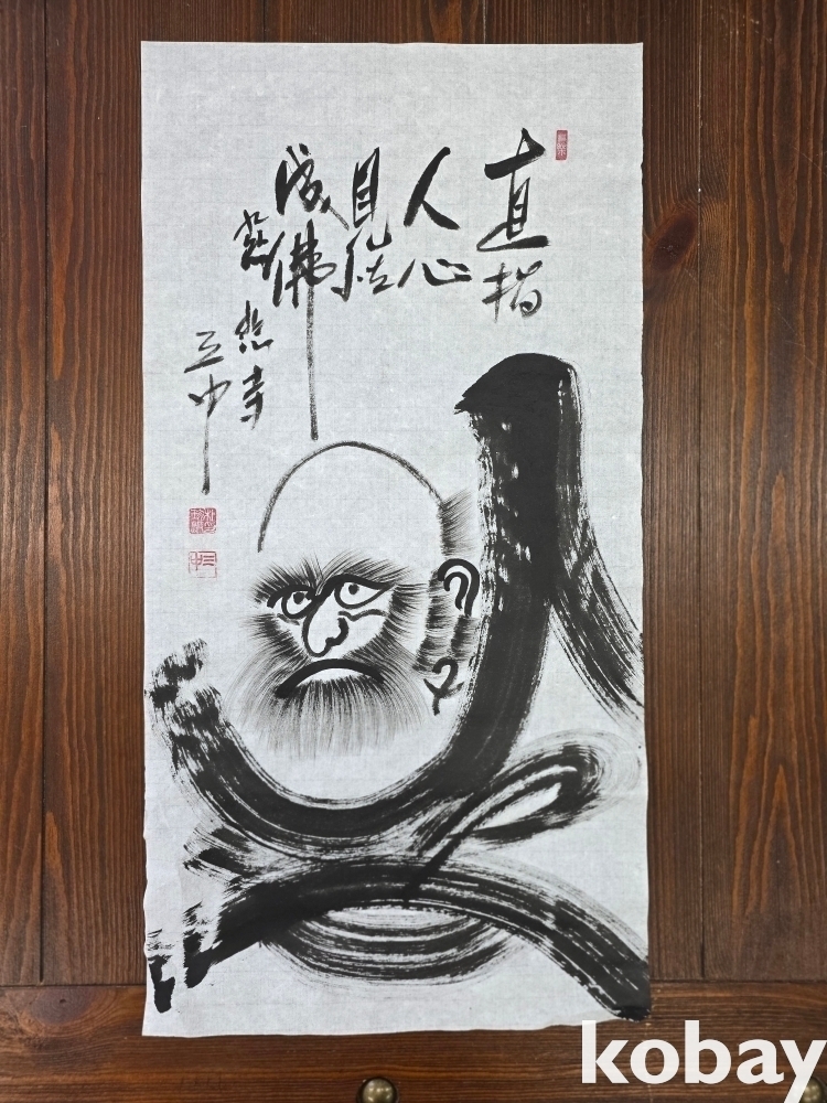 본 출품작 ‘달마도’는 삼중스님의 예술세계가 응축된 작품으로, 달마대사의 내면을 농묵과 여백을 통해 표현했다. 상단의 ‘직지인심 견성성불(直指人心 見性成佛)’ 구절은 수행의 본질을 드러내며, 필선의 흐름과 붓선의 리듬이 화면 전반을 이룬다.
